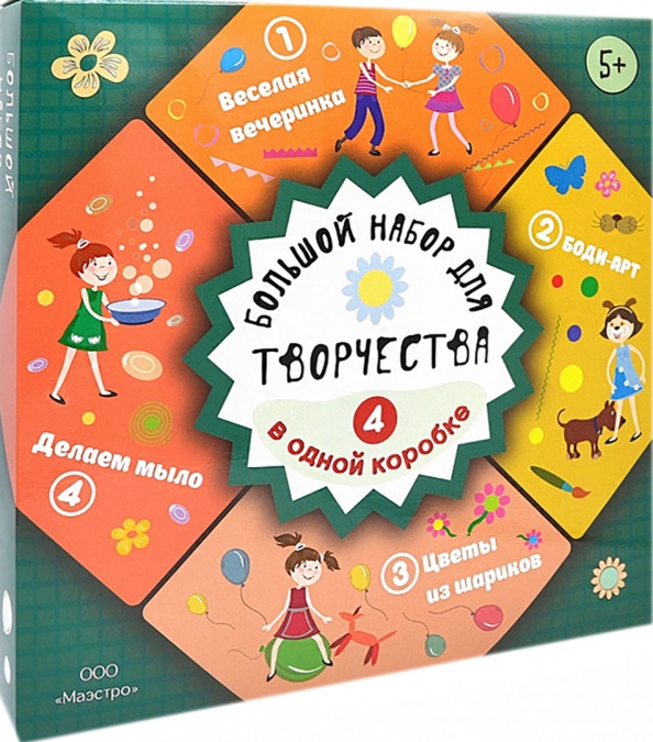 Поделки из бумаги, игрушки из помпончиков, мыло своими руками и кулинарные рецепты - 4 блистера с разнообразными компонентами и четыре 48-страничных книги в твердом переплете с подробными инструкциями и цветными иллюстрациями.