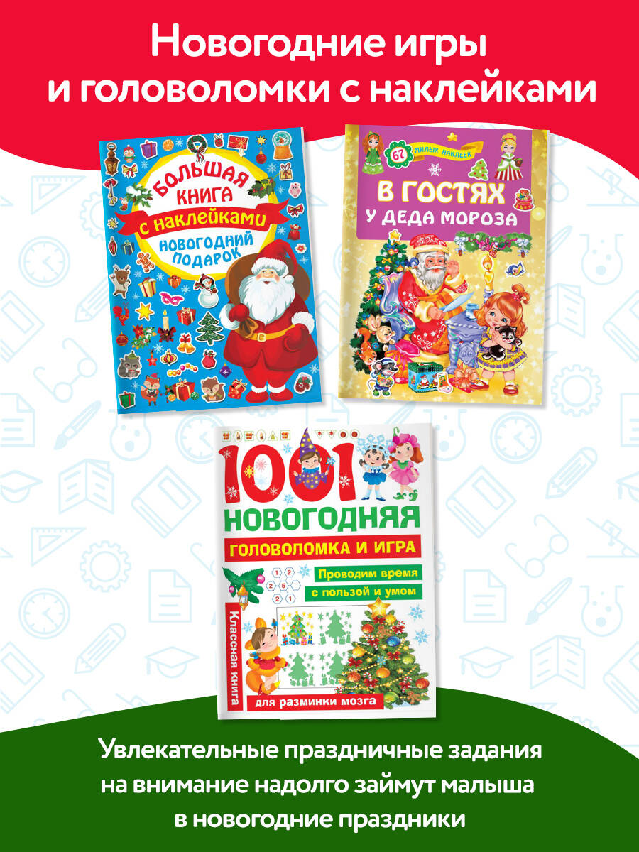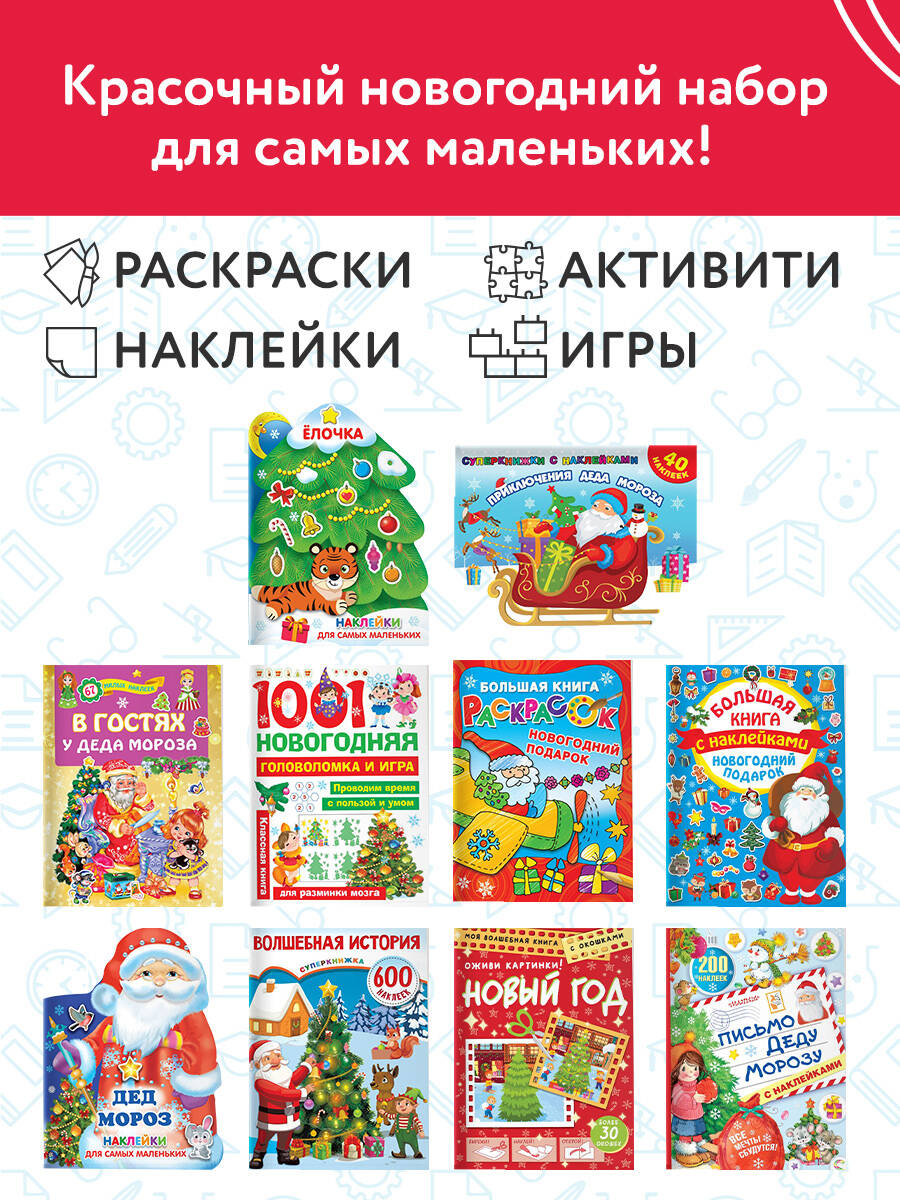 Большой новогодний подарок ребёнку - комплект из 10 книг, которые помогут организовать увлекательные домашние занятия с ребёнком в течение всех новогодних праздников. В комплекте - развивающие издания для весёлого и полезного досуга малыша: новогодние сказки, шаблоны для писем Деду Морозу, объёмные поделки, вырезалки-оригами с зимними сюжетами, игры с наклейками, головоломки, лабиринты и, конечно, новогодние раскраски! - книги с большим выбором интересных и полезных заданий, которые надолго займут малыша.| Издательство | ИЗДАТЕЛЬСТВО "АСТ" |