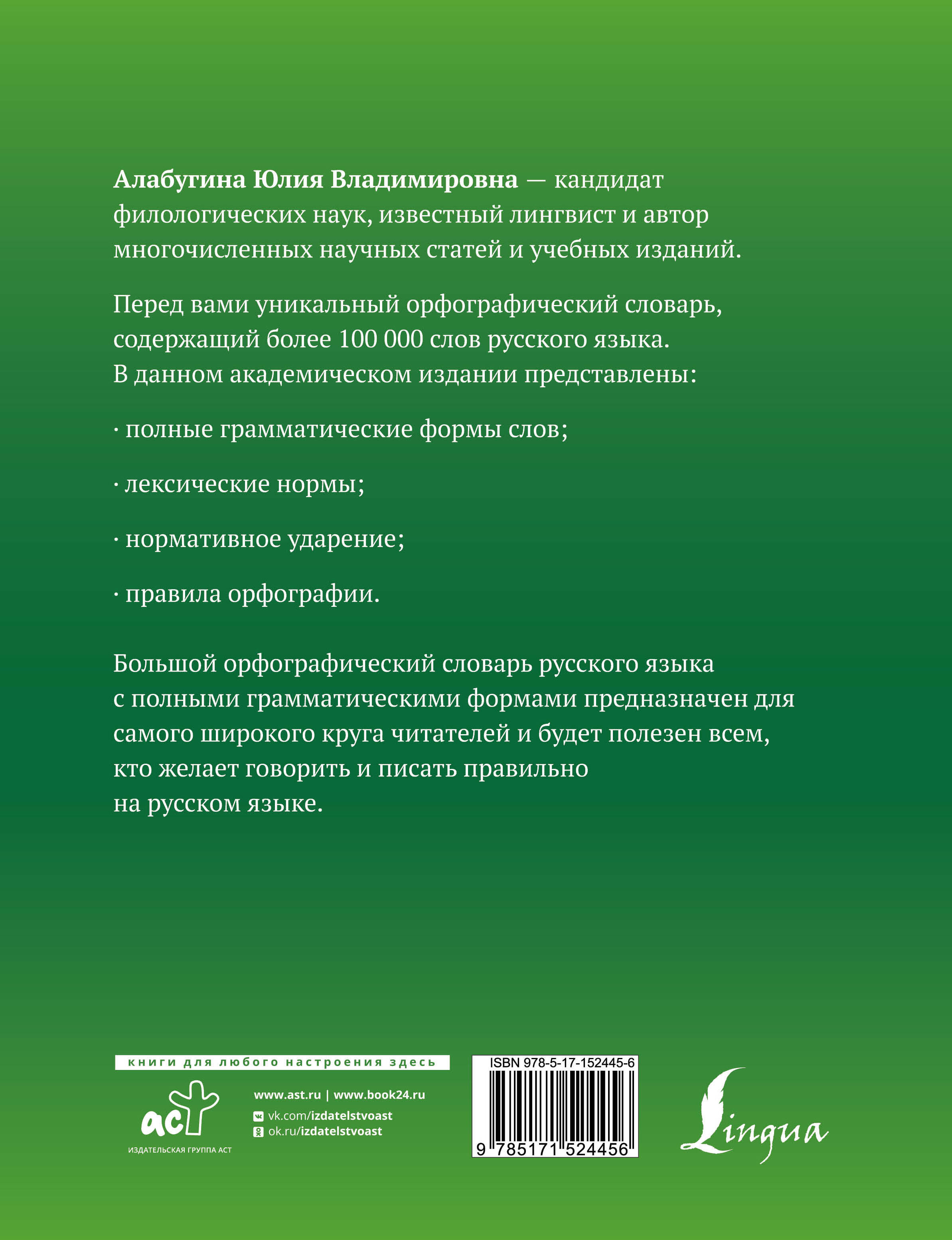 Большой орфографический словарь русского языка с полными грамматическими формами - это академическое справочное издание, автором которого является кандидат филологических наук и автор многочисленных научных изданий Алабугина Юлия Владимировна. Словарь насчитывает около 100 тыс. слов, каждое из которых сопровождается объемным списком грамматических форм, представленных полностью. Словник издания тщательно выверен и соответствует актуальным тенденциям русского языка. В заключительной части представлены правила орфографии. которые служат отличным дополнением к словарю. Таким образом настоящее издание орфографического словаря является академическим справочником орфографии русского языка. Книга предназначена для самого широкого круга читателей, в том числе для студентов различных профессий и представителей литературной и информационной сферы.| Издательство | ИЗДАТЕЛЬСТВО "АСТ" |