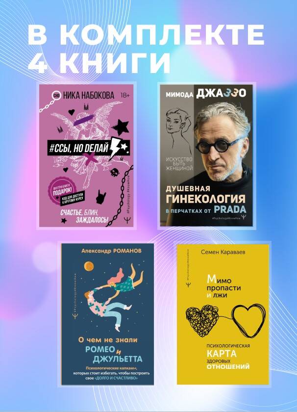 В комплект входят книги: • Джаззо М. Душевная гинекология в перчатках от Prada. Искусство быть женщиной • Романов А. О чем не знали Ромео и Джульетта. Психологические капканы, которых стоит избегать, чтобы построить свое "долго и счастливо" • Караваев С. Мимо пропасти и лжи. Психологическая карта здоровых отношений Книги, которые могут осветить путь к вашим идеальным отношениям. Сложная тема отношений разложена по полочкам: ошибки, манипуляции, несовпадение ценностей. Вы узнаете все о том, что мешает вашему личному счастью.| Издательство | Издательство "АСТ" |