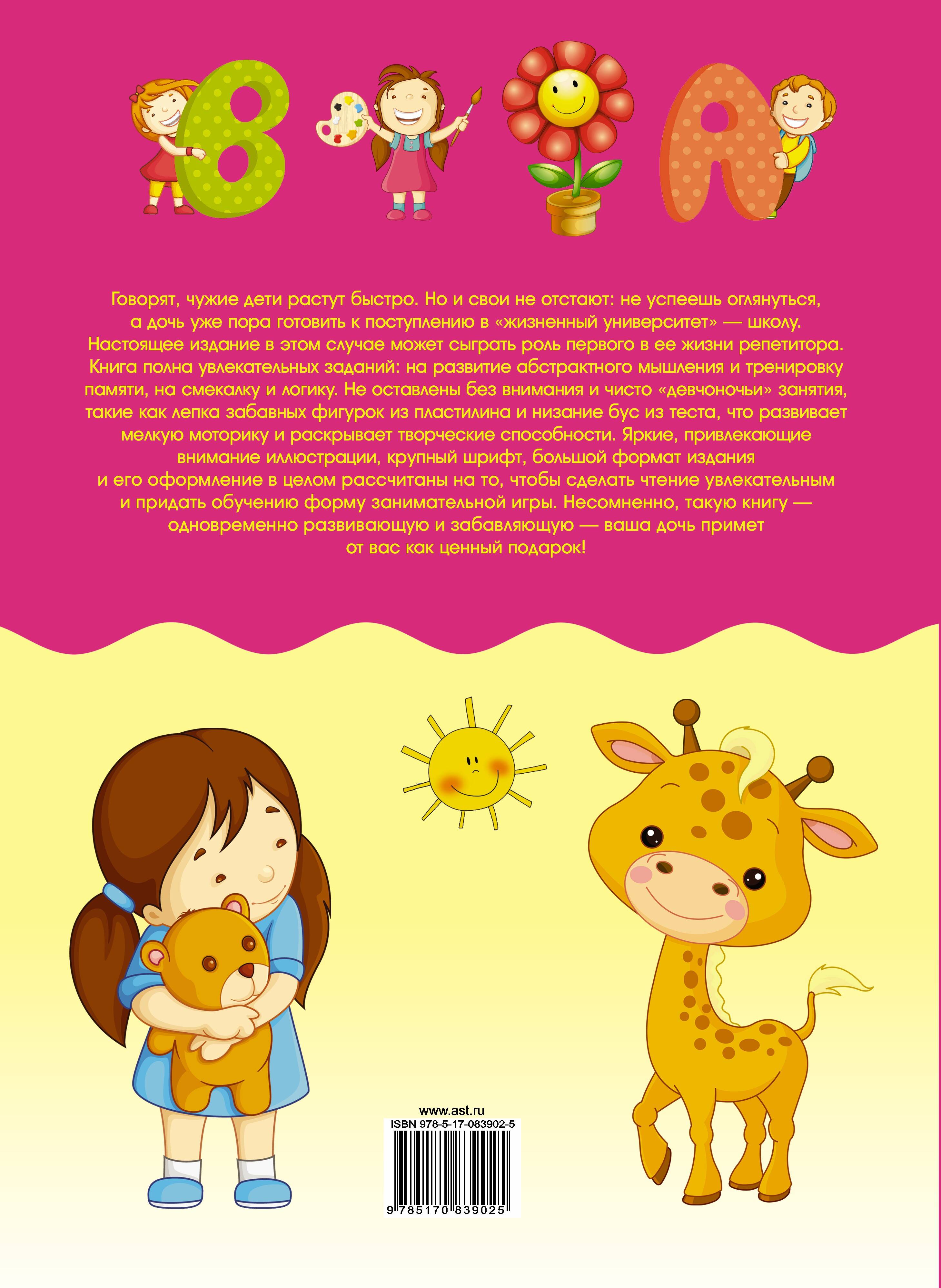 Говорят, чужие дети растут быстро. Но и свои не отстают: не успеешь оглянуться, а дочь уже пора готовить к поступлению в "жизненный университет" - школу. Настоящее издание в этом случае может сыграть роль первого в ее жизни репетитора. Книга полна увлекательных заданий: на развитие абстрактного мышления и тренировку памяти, на смекалку и логику. Не оставлены без внимания и чисто "девчоночьи" занятия, такие как лепка забавных фигурок из пластилина и низание бус из теста, что развивает мелкую моторику и раскрывает творческие способности. Яркие, привлекающие внимание иллюстрации, крупный шрифт, большой формат издания и его оформление в целом рассчитаны на то, чтобы сделать чтение увлекательным и придать обучению форму занимательной игры. Несомненно, такую книгу - одновременно развивающую и забавляющую - ваша дочь примет от вас как ценный подарок!| Издательство | Издательство "АСТ" |