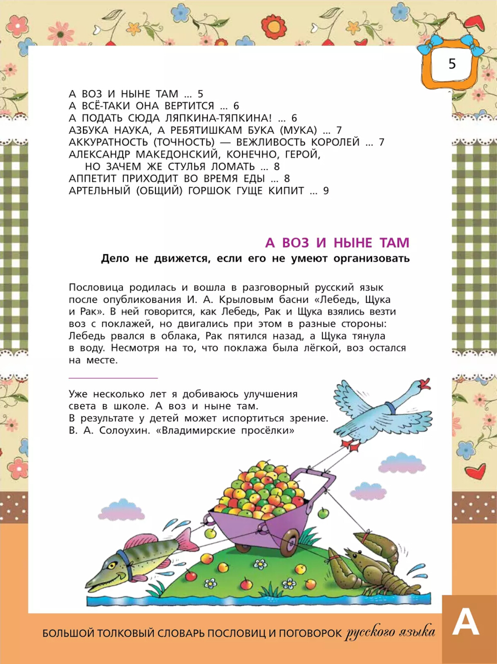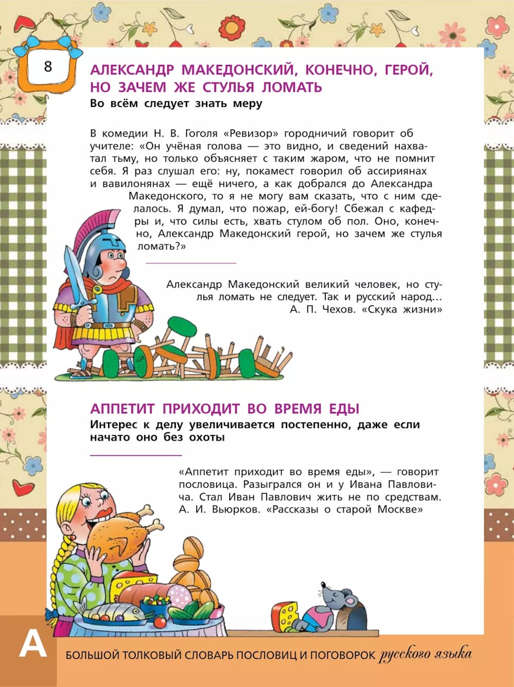 «Большой толковый словарь пословиц и поговорок русского языка» - это уникальное иллюстрированное издание для детей среднего школьного возраста, их родителей и воспитателей, а также всех, кто интересуется русским языком, литературой и культурно-историческими особенностями родной речи. Данный словарь содержит наиболее распространённые пословицы и поговорки. В издании приводится их толкование, примеры использования в русской современной и классической литературе. Понять смысл и значение пословиц и поговорок помогают красочные иллюстрации, дополняющие текст.| Издательство | Просвещение-Союз |