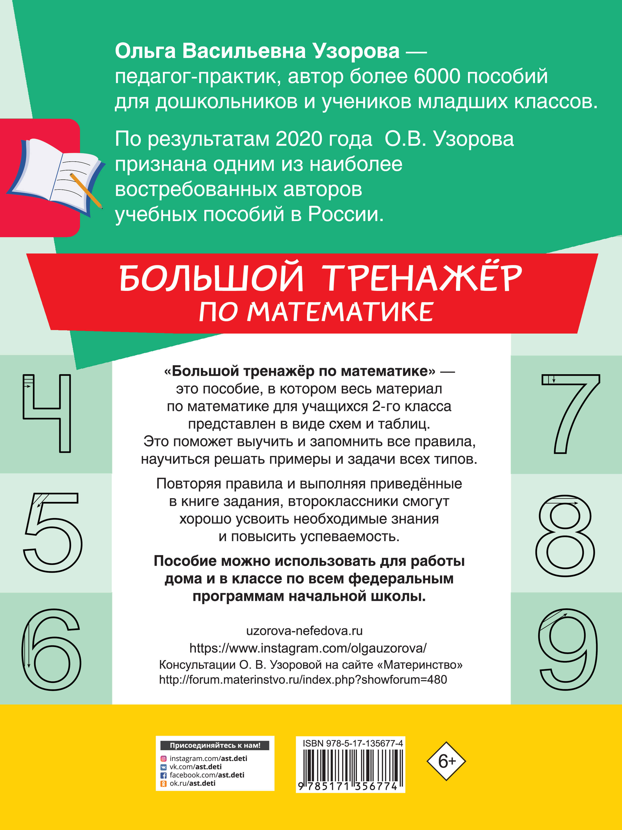 О чём эта книга «Большой тренажёр по математике. 2-й класс» - это сборник упражнений по математике для учеников начальной школы. Занимаясь по книге, школьники повторят наиболее сложные темы по программе 2-го класса и научатся на практике применять знания, полученные в процессе обучения. Кому эта книга будет интересна Незаменимое пособие для учащихся начальной школы. Каковы особенности этой книги • Автор пособия - О. В. Узорова, известный педагог-практик, автор более 6 000 пособий для дошкольников и учеников младших классов. • Занятия по книге позволят ученикам повысить успеваемость и подготовиться к контрольным и проверочным работам. • Пособие можно использовать для работы дома и в классе по всем федеральным программам начальной школы.| Издательство | Издательство "АСТ" |