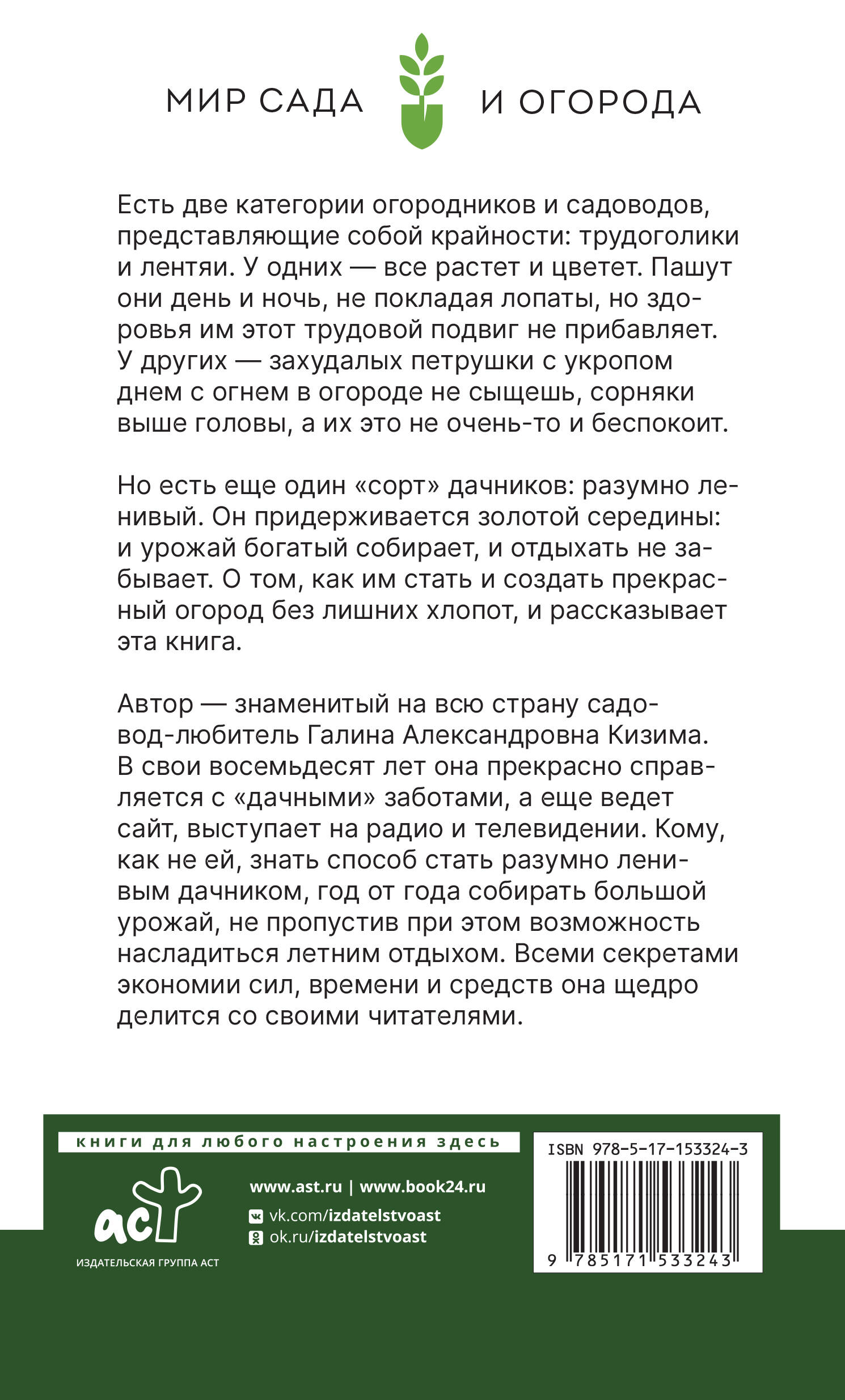 Есть две категории огородников и садоводов, представляющие собой крайности: трудоголики и лентяи. У одних - все растет и цветет. Пашут они день и ночь, не покладая лопаты, но здоровья им этот трудовой подвиг не прибавляет. У других - захудалых петрушки с укропом днем с огнем в огороде не сыщешь, сорняки выше головы, а их это не очень-то и беспокоит. Но есть еще один "сорт" дачников: разумно ленивый. Он придерживается золотой середины: и урожай богатый собирает, и отдыхать не забывает. О том, как им стать и создать прекрасный огород без лишних хлопот, и рассказывает эта книга. Автор - знаменитый на всю страну садовод-любитель Галина Александровна Кизима. В свои восемьдесят лет она прекрасно справляется с "дачными" заботами, а еще ведет сайт, выступает на радио и телевидении. Кому, как не ей, знать способ стать разумно ленивым дачником, год от года собирать большой урожай, не пропустив при этом возможность насладиться летним отдыхом. Всеми секретами экономии сил, времени и средств она щедро делится со своими читателями.| Издательство | ИЗДАТЕЛЬСТВО "АСТ" |