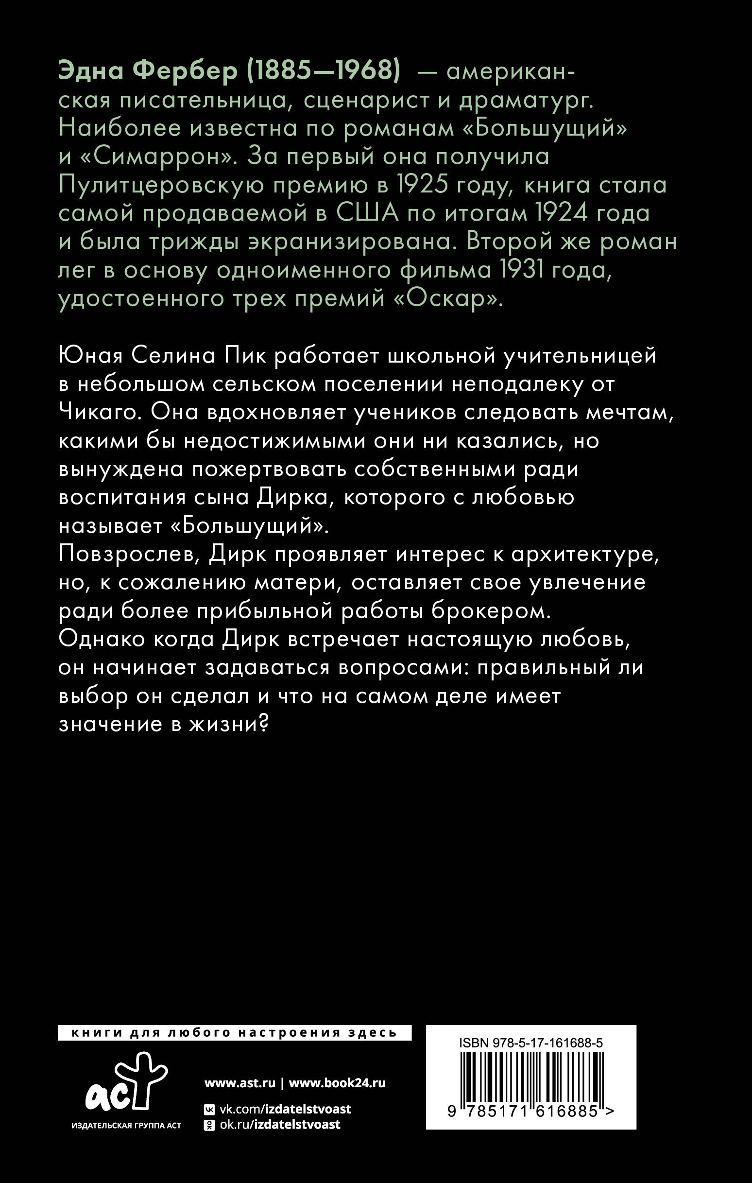 Эдна Фербер признавалась, что не могла не написать «Большущего», но первое время сомневалась, что хоть кто-то кроме неё захочет прочесть эту книгу - и даже извинялась перед собственным издателем, что прислала такой некоммерческий роман. Однако «Большущий» мгновенно стал хитом - роман разошелся тиражом в несколько сотен тысяч экземпляров за считанные месяцы после релиза и стал самой продаваемой художественной книгой по итогам 1924 года. В 1925 году «Большущий» завоевал Пулитцеровскую премию в номинации «Роман года». Книга неоднократно адаптировалась для радио, кино и телевидения.| Издательство | Издательство "АСТ" |