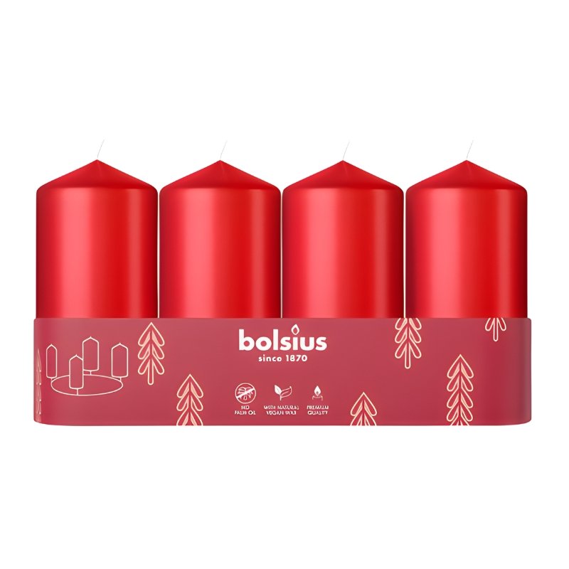 Bolsius Цилиндрические свечи красные 4 шт. (Ø100 × 48 mm) - набор классических красных цилиндрических свечей для домашнего декора, подходит для подсвечников, праздничного стола или создания уютной атмосферы. Свечи без запаха, обеспечивают стабильное и ровное горение. Время горения: примерно 20 часов на свечу в зависимости от условий использования.