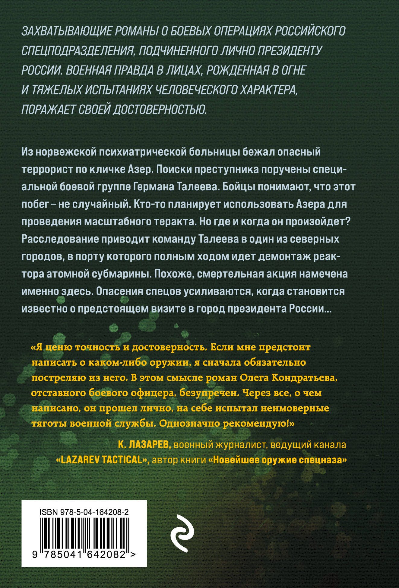 Из норвежской психиатрической больницы бежал опасный террорист по кличке Азер. Поиски преступника поручены специальной боевой группе Германа Талеева. Бойцы понимают, что этот побег - не случайный. Кто-то планирует использовать Азера для проведения масштабного теракта. Но где и когда он произойдет? Расследование приводит команду Талеева в один из северных городов, в порту которого полным ходом идет демонтаж реактора атомной субмарины. Похоже, смертельная акция намечена именно здесь. Опасения спецов усиливаются, когда становится известно о предстоящем визите в город президента России… Захватывающие романы о боевых операциях российского спецподразделения, подчиненного лично Президенту России. Военная правда в лицах, рожденная в огне и тяжелых испытаниях человеческого характера, поражает своей достоверностью.| Издательство | Эксмо |