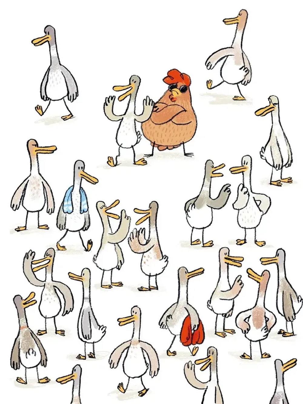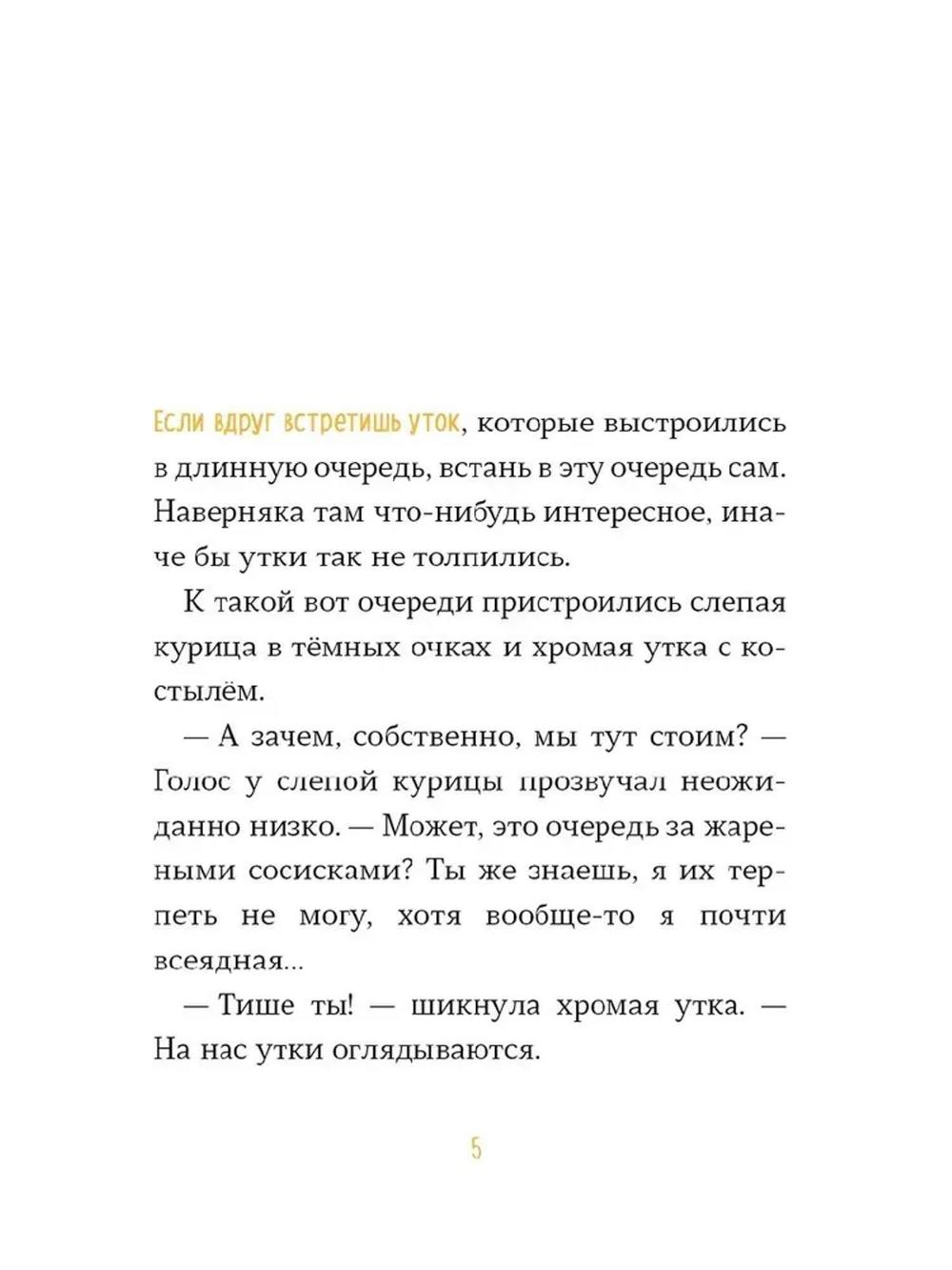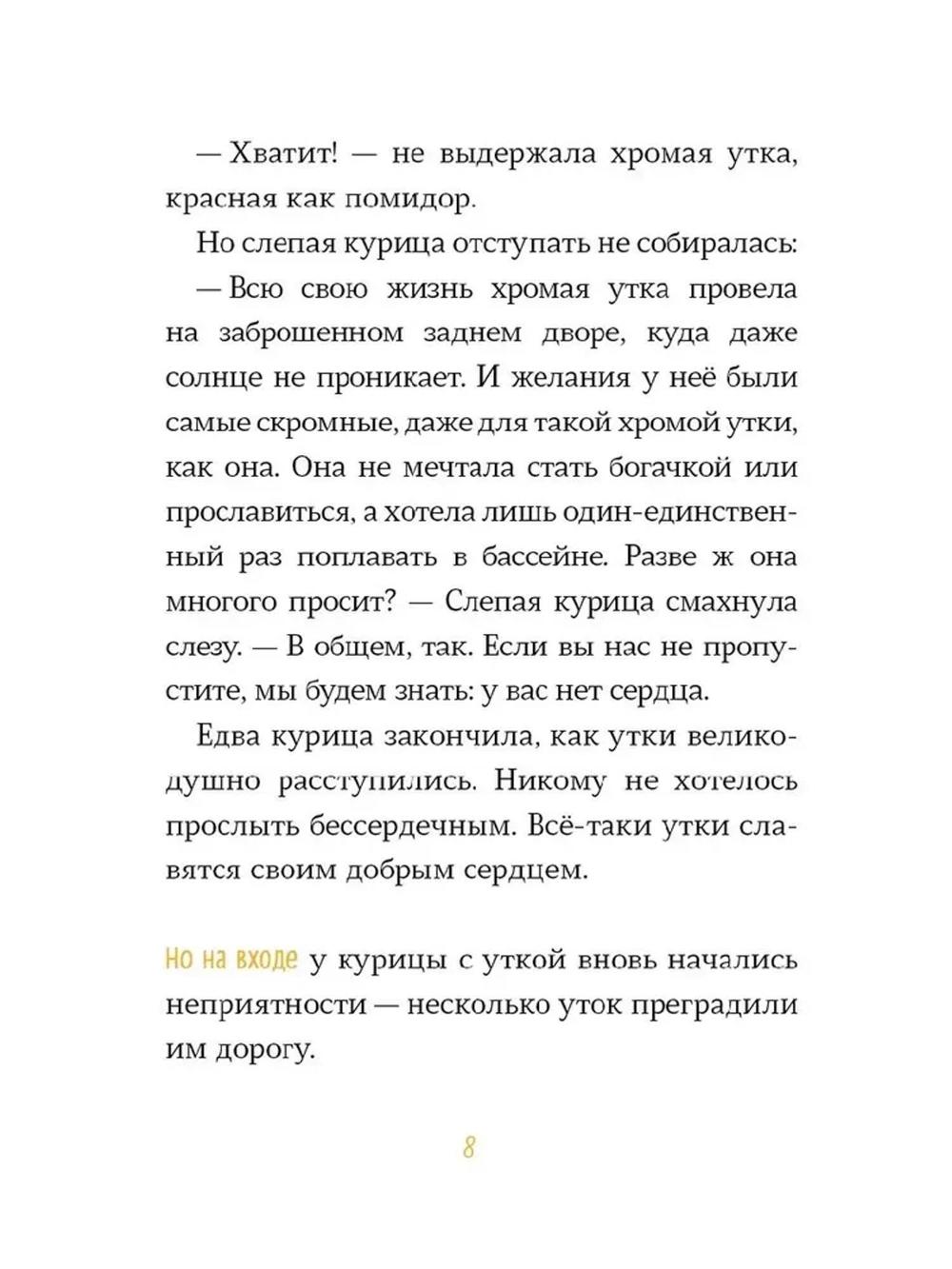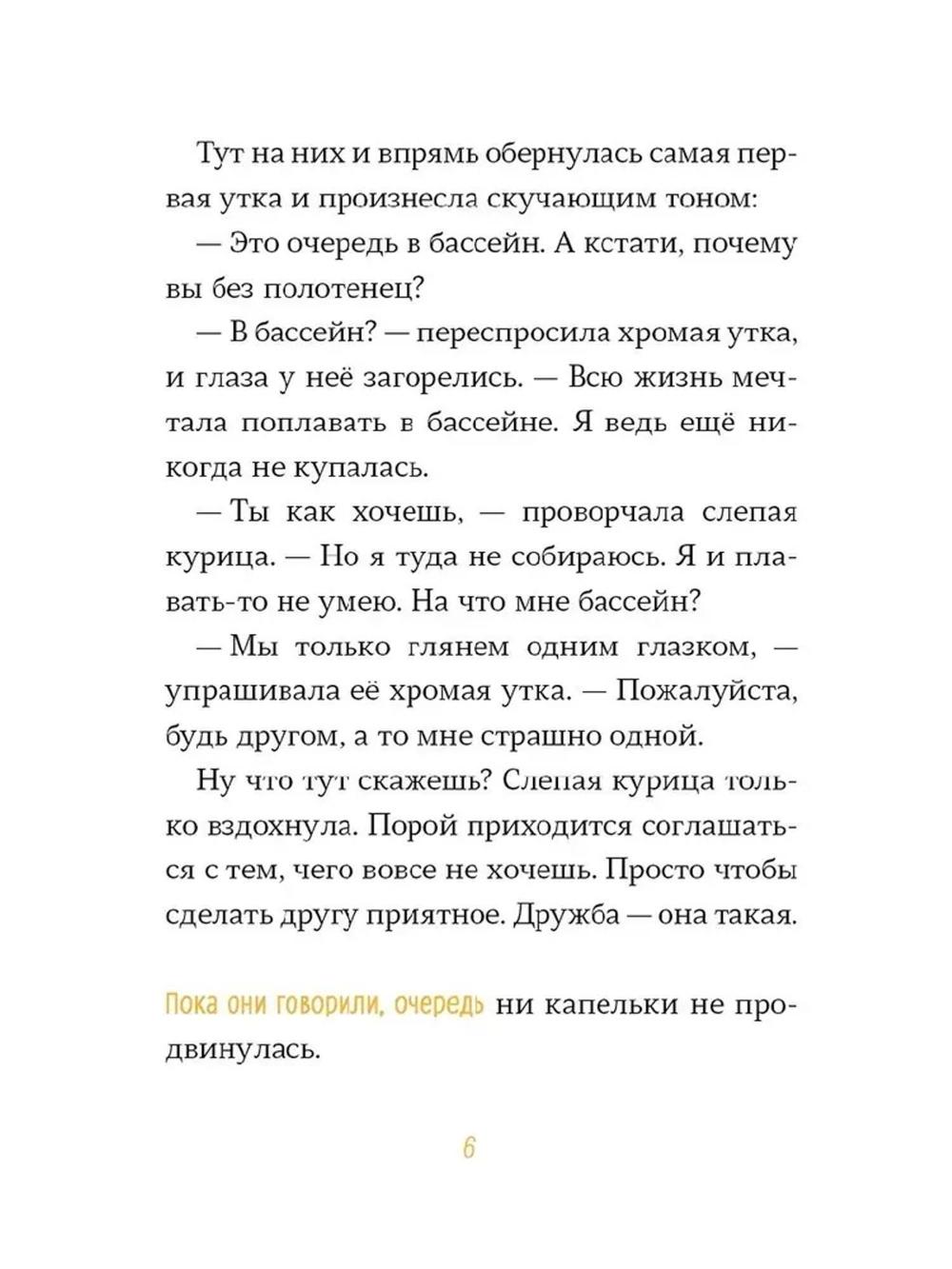 Хромая утка всю жизнь мечтала поплавать в бассейне. А ведь мечты должны сбываться. Правда, есть одна проблема: бассейн только для уток. Но кто-то же должен приглядывать за хромой уткой! Лучше слепой курицы никто с этим не справится. Да, но утка-то надеется подружиться с сородичами - а как, если курица не отходит от неё ни на шаг? И, ко всему прочему, ещё и возомнила себя важной птицей. Кажется, их дружба под угрозой..