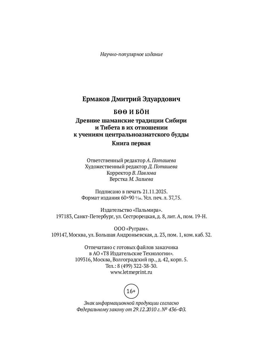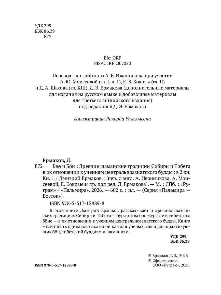 В этой книге Дмитрий Ермаков рассказывает о древних шаманских традициях Сибири и Тибета - бурятском боо мургэле и тибетском бoне - в их отношении к учениям центральноазиатского будды. Книга может быть одинаково полезной как для ученых, так и для практикующих бoн, тибетский буддизм и шаманизм.| Издательство | Т8 RUGRAM |