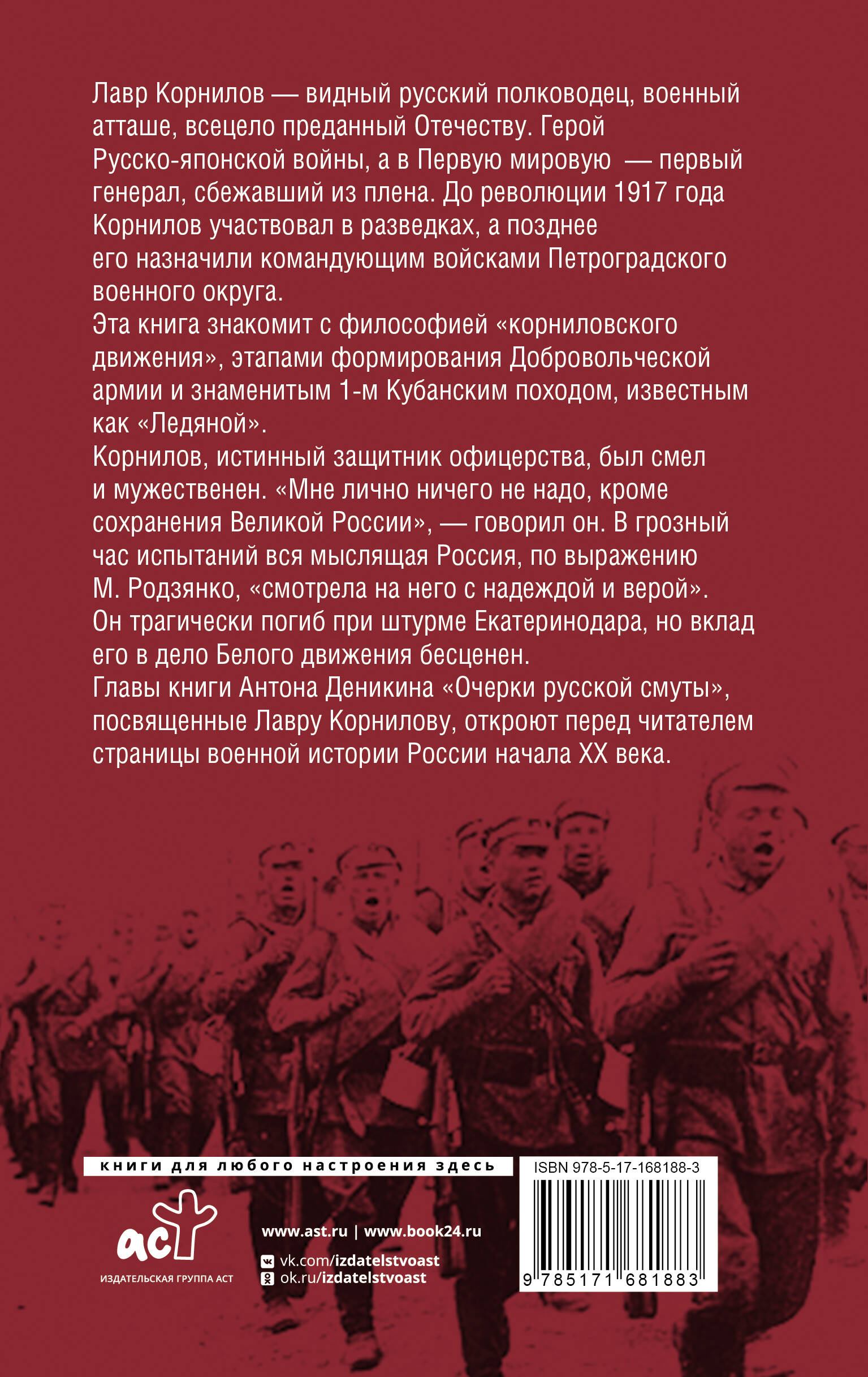 Лавр Корнилов - видный русский полководец, военный атташе, всецело преданный Отечеству. Герой Русско-японской войны, а в Первую мировую - первый генерал, сбежавший из плена. До Революции 1917 года Корнилов участвовал в разведках, а позднее его назначили командующим войсками Петроградского военного округа. Эта книга знакомит с философией "корниловского движения", этапами формирования Добровольческой армии и знаменитым 1-м Кубанским походом, известным как "Ледяной". Корнилов, истинный защитник офицерства, был смел и мужественен. "Мне лично ничего не надо, кроме сохранения Великой России", - говорил он. В грозный час испытаний вся мыслящая Россия, по выражению М.Родзянко, "смотрела на него с надеждой и верой". Он трагически погиб при штурме Екатеринодара, но вклад его в дело Белого движения бесценен. Главы книги Антона Деникина "Очерки русской смуты", посвященные Лавру Корнилову, откроют перед читателем страницы военной истории России начала XX века.| Издательство | Издательство "АСТ" |