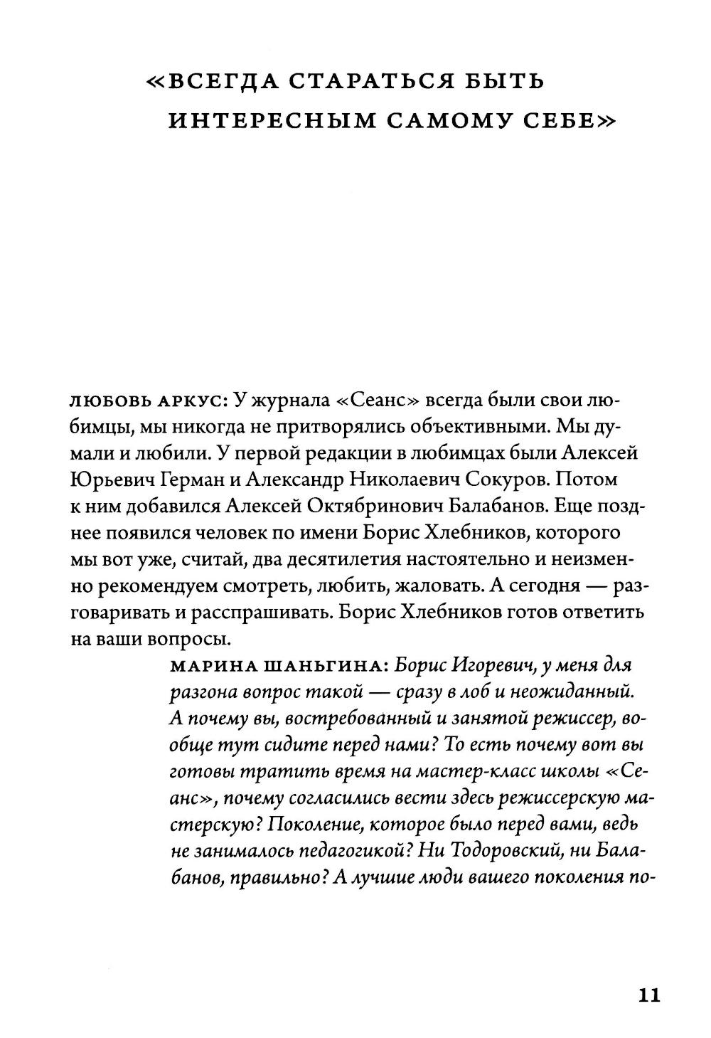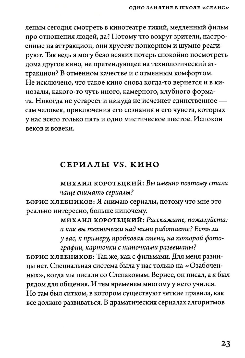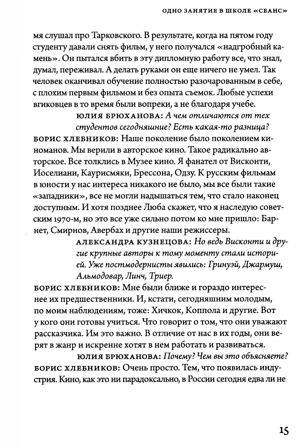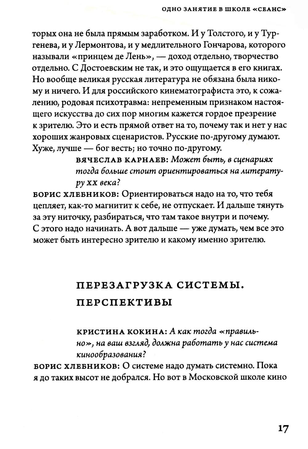 В основе этой серии книг - мастер-классы онлайн-школы «Сеанс». На этот раз с нашими студентами беседует один из любимых и постоянных героев журнала «Сеанс», а с недавнего времени один из мастеров нашей школы - режиссер Борис Хлебников. Сегодня он много работает как кинодраматург, редактор, креативный продюсер. Поэтому в центре разговора - не только его картины «Коктебель», «Сумасшедшая помощь», «Аритмия», сериала «Обычная женщина», но и механика кинематографического соавторства. Как взаимодействовать со сценаристами, операторами и актерами? Какими качествами должен обладать идеальный продюсер? Как сделать кино, интересное зрителю, и остаться интересным самому себе? Издание дополняют беседы Бориса Хлебникова с Любовью Аркус, а также избранные статьи о фильмах и сериалах режиссера, написанные для «Сеанса». Борис Хлебников Мастер школы «Сеанс» - совместно с Наталией Мещаниновой руководит мастерской кинорежиссеров и проводит авторские мастер-классы в рамках годового курса «Кино и контекст».| Издательство | СЕАНС |