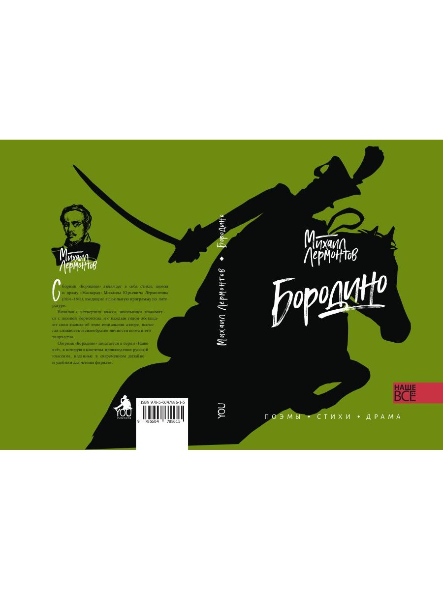 Сборник «Бородино» включает в себя стихи, поэмы и драму «Маскарад» Михаила Юрьевича Лермонтова (1814-1841), входящие в школьную программу по литературе. Начиная с четвертого класса, школьники знакомятся с поэзией Лермонтова и с каждым годом обогащают свои знания об этом гениальном авторе, постигая сложность и своеобразие личности поэта и его творчества. Сборник «Бородино» печатается в серии «Наше всё», в которую включены произведения русской классики, изданные в современном дизайне и удобном для чтения формате. В этой серии уже вышли произведения А. С. Пушкина «Евгений Онегин» и «Капитанская дочка», сборники рассказов: «Вечера на хуторе близ Диканьки» Н. В. Гоголя и «Темные аллеи» И. А. Бунина.