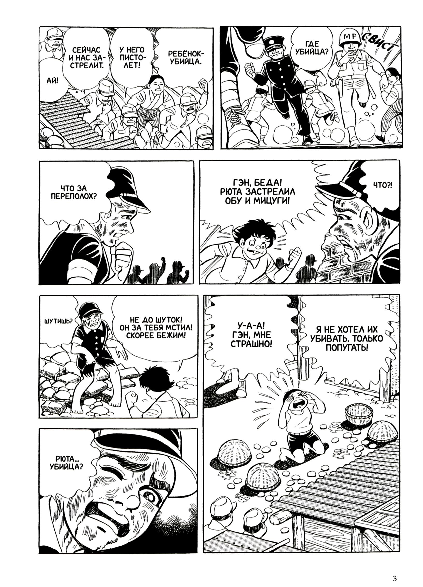 Ровно через два года после атомной бомбардировки в Хиросиме отмечают первый праздник мира. Гэн снова ходит в школу, но в классе между парт гуляет ветер: здание, как и весь город, по-прежнему лежит в руинах. Не затянулись и раны жителей города: тех, кто пережил атомный взрыв, считают нечистыми и заразными. В разорённой Японии расцветает преступность. Рюта, названый брат Гэна, попадает в банду якудза, которые не гнушаются использовать детей в своих делах. Старик Хираяма, которого приютили Гэн и его друзья, перед смертью успевает дописать роман об атомном взрыве. Американская оккупационная администрация не желает распространения такой информации, но Гэн и его друзья собираются издать книгу во что бы то ни стало.| Издательство | Alt Graph |