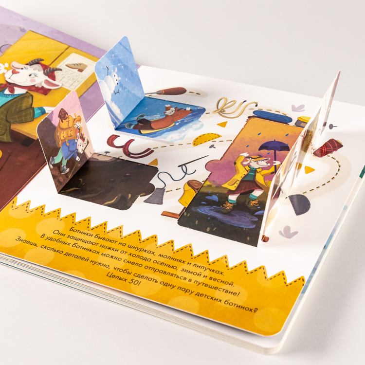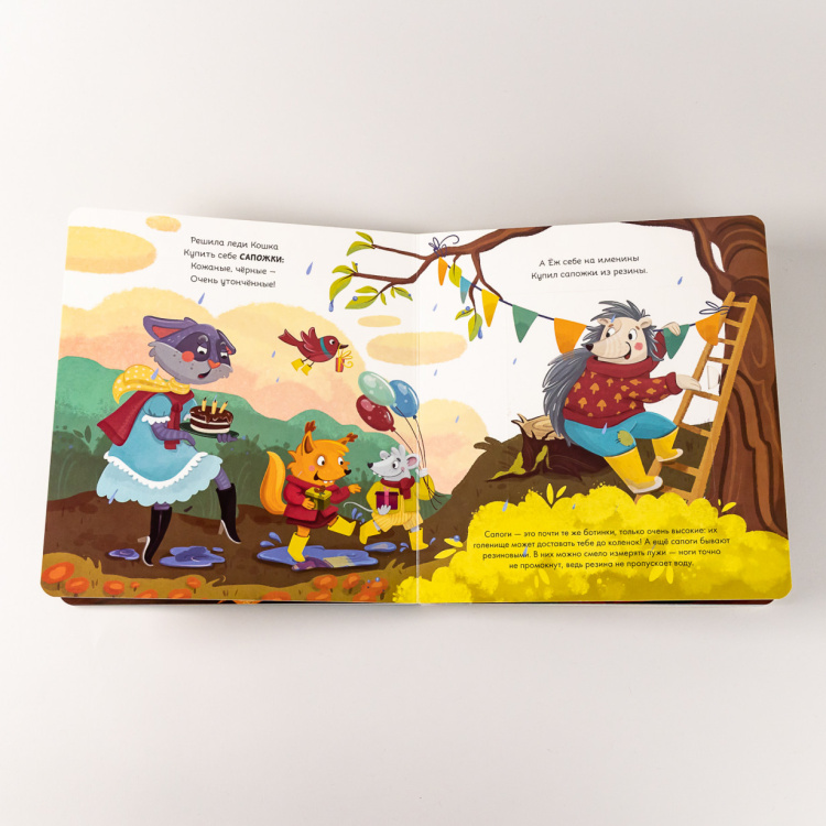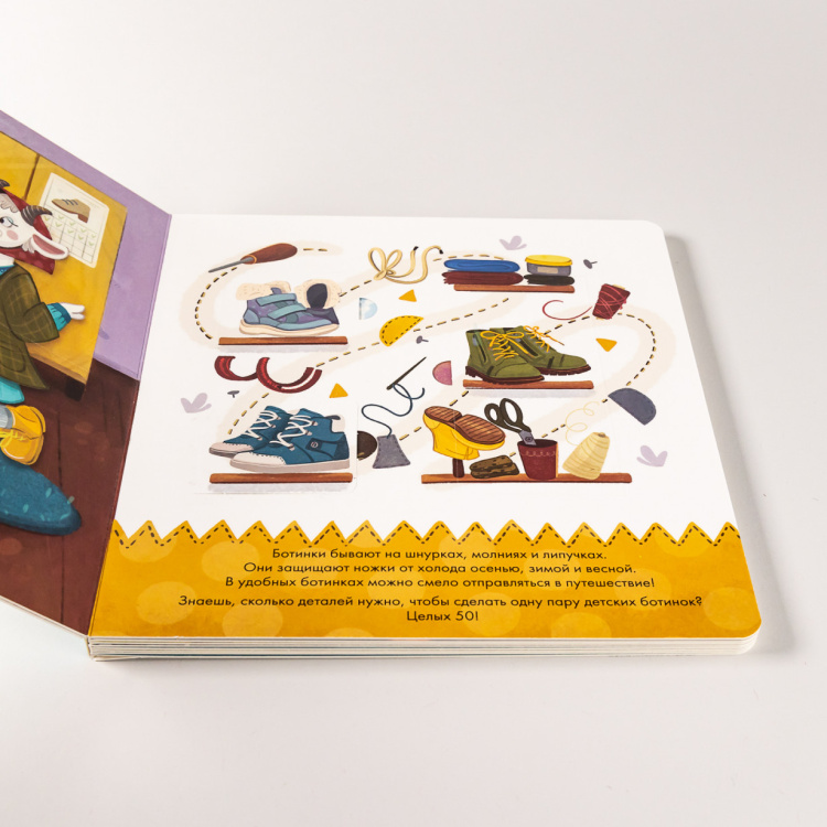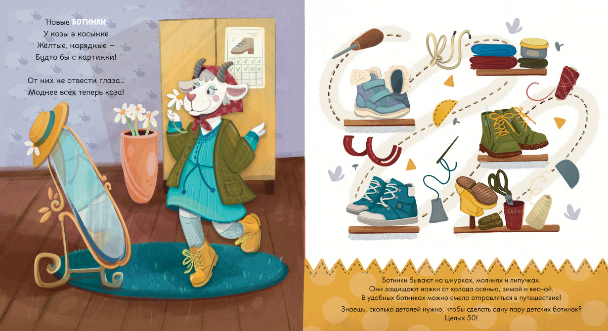 <div class="b-post-content _bookPage"><h2 id="o-chem">О чем</h2><p>На каждой странице маленьких читателей ждут интересные факты, яркие иллюстрации с окошками и новые полезные знания! А лучше их запомнить поможет Котофей. Ведь он не обычный кот: Котофей делает удобную и красивую обувь для всех своих друзей. </p><p>С помощью этой книги ребенок не только узнает, для чего предназначены разные виды обуви. Детальные иллюстрации и специальные клапаны-окошки помогут познакомиться с разными животными и пофантазировать о том, какие же ситуации с ними происходят. Читайте забавные стихи и развивайте интеллект и творческое мышление!</p><div class="box _cite"><div class="i-cite"><p class="i-cite__text"> Решила леди Кошка<br></br> Купить себе сапожки:<br></br> Кожаные, чёрные -<br></br> Очень утончённые! </p></div></div><h2 id="zachem-chitat">Зачем читать</h2><p></p><ul><li>Чтобы узнать про разные виды обуви и ее предназначение </li><li>Узнать интересные факты о разной обуви </li><li>Познакомиться с разными зверями</li></ul><p></p><div class="box _cite"><div class="i-cite"><p class="i-cite__text"> Сапоги - это почти те же ботинки, только очень высокие: их голенище может доставать тебе до коленок! А ещё сапоги бывают резиновыми. В них можно смело измерять лужи - ноги точно не промокнут, ведь резина не пропускает воду. </p></div></div></div>| Издательство | Альпина |