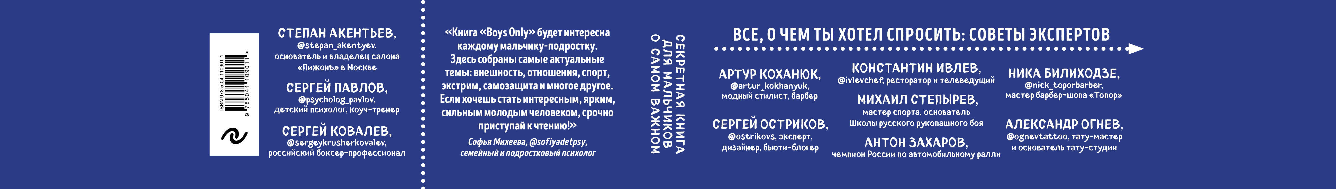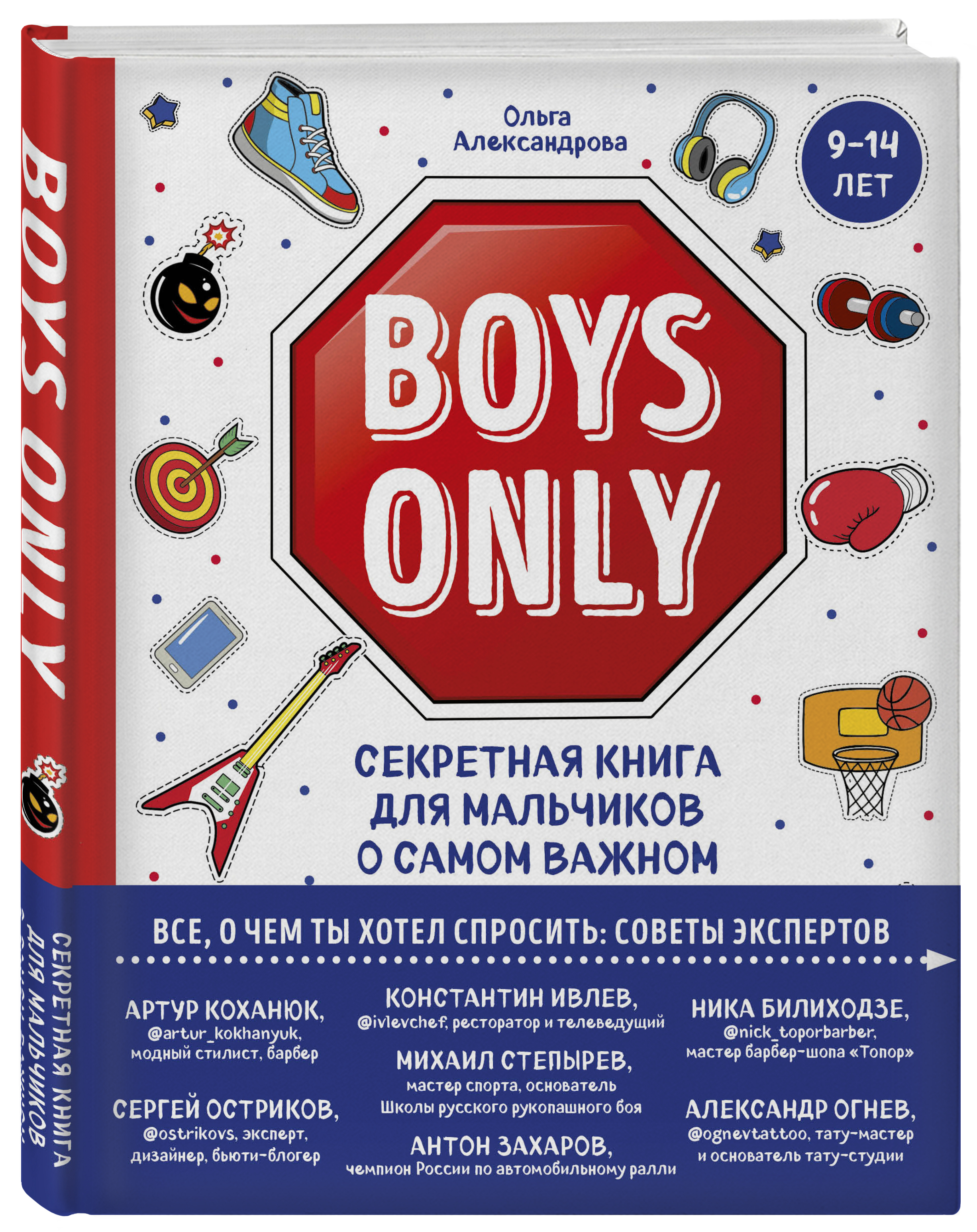 В этой книге ты познакомишься с крутыми мальчишками - Артемом, Денисом и Максимом. Вместе вы узнаете много нового и интересного, а также получите ответы на самые важные и волнующие вопросы. В этом тебе помогут эксперты, популярные блогеры и старший друг Константин. Взрослей, учись и веселись вместе с ними! Ты узнаешь: - как ответить хулиганам и не дать себя в обиду; - что делать, чтобы всегда быть сильным и ловким; - как стать интересным девочкам; - что поможет навсегда избавиться от прыщей; - какой вид спорта подойдет тебе больше всего; - что надеть в школу и на встречу с друзьями, чтобы выглядеть стильно; - в какие интересные компьютерные игры тебе не запретят играть даже родители. Полезные советы, интересные тесты, задания и увлекательные анкеты - эта книга точно не даст тебе заскучать! «Я вам точно скажу: успеха в жизни добивается тот, кто владеет знаниями. Секреты, раскрываемые в этой книге, делают ее чертовски уникальным артефактом для подростка». - Михаил Степырев, мастер спорта, инструктор по рукопашному бою «Книга «Boys Only» будет интересна каждому мальчику-подростку. Здесь собраны самые актуальные темы: внешность, отношения, спорт, экстрим, самозащита и многое другое. Если хочешь стать интересным, ярким, сильным молодым человеком, срочно приступай к чтению!» - Софья Михеева, @sofiyadetpsy, семейный и подростковый психолог| Издательство | ООО "Издательство "Эксмо" |