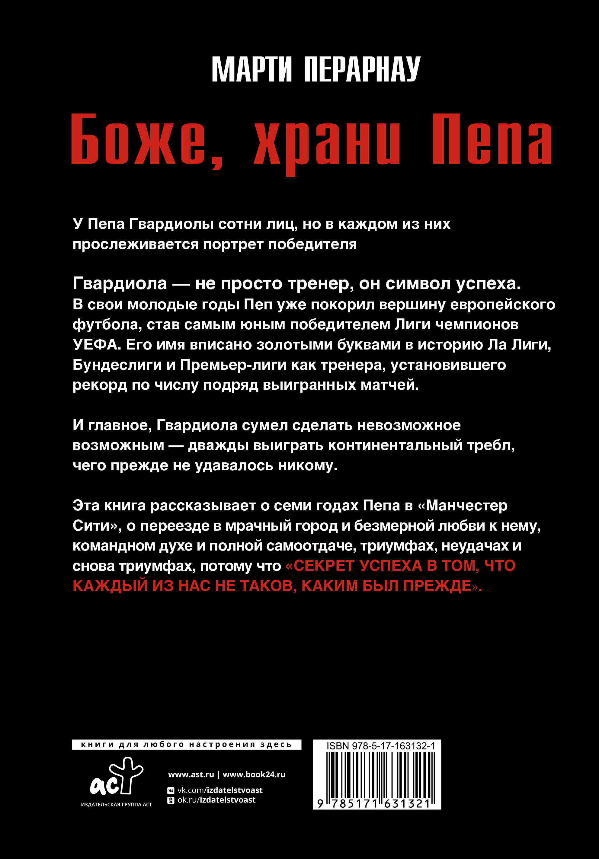 - Эксклюзивное подарочное издание для любителей футбола! - Новая книга спортивного журналиста Марти Перарнау о знаменитом тренере Пепе Гвардиоле. - Пеп Гвардиола - живая легенда мирового футбола. Главный тренер клуба Премьер-лиги «Манчестер Сити», единственный в мире руководитель футбольного клуба, дважды взявший континентальный требл, самый молодой тренер в мире, обеспечивший своей команде победу в Лиге чемпионов УЕФА, держатель рекорда по наибольшему числу выигранных подряд игр в Ла Лиге, Бундеслиге и Премьер-лиге. - «Боже, храни Пепа» - хроника семи лет Пепа Гвардиолы в роли главного тренера «Манчестер Сити». От тяжелого старта до триумфального сезона 2022-2023 гг, когда клуб выиграл Чемпионат Англии, Кубок Англии и, самое главное, Лигу чемпионов. - Триумфы, поражения, страхи, сомнения, эйфория победы. Книга написана человеком, приближенным к Гвардиоле и тонко прочувствовавшим все, что случилось с ним за эти годы. Эта книга - удивительный путь Пепа, на котором читатель повстречает тысячи людей.| Издательство | Издательство "АСТ" |