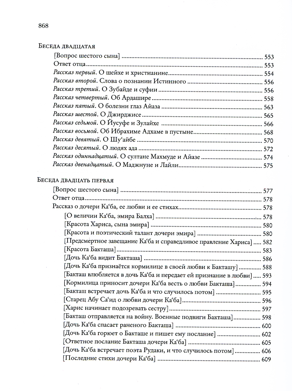 Сыновья открываются отцу в своих желаниях, а тот в ответ начинает рассказывать им многочисленные увлекательные истории. Герои этих историй разнообразны: это исторические и литературные персонажи, знаменитые цари и безымянные старушки, купцы, прекрасные женщины и не менее прекрасные юноши, святые подвижники, воины, пророки, мусульмане, христиане, зороастрийцы, ангелы, пророки, небесные светила, собаки, кошки, муравьи и неодушевленные предметы.