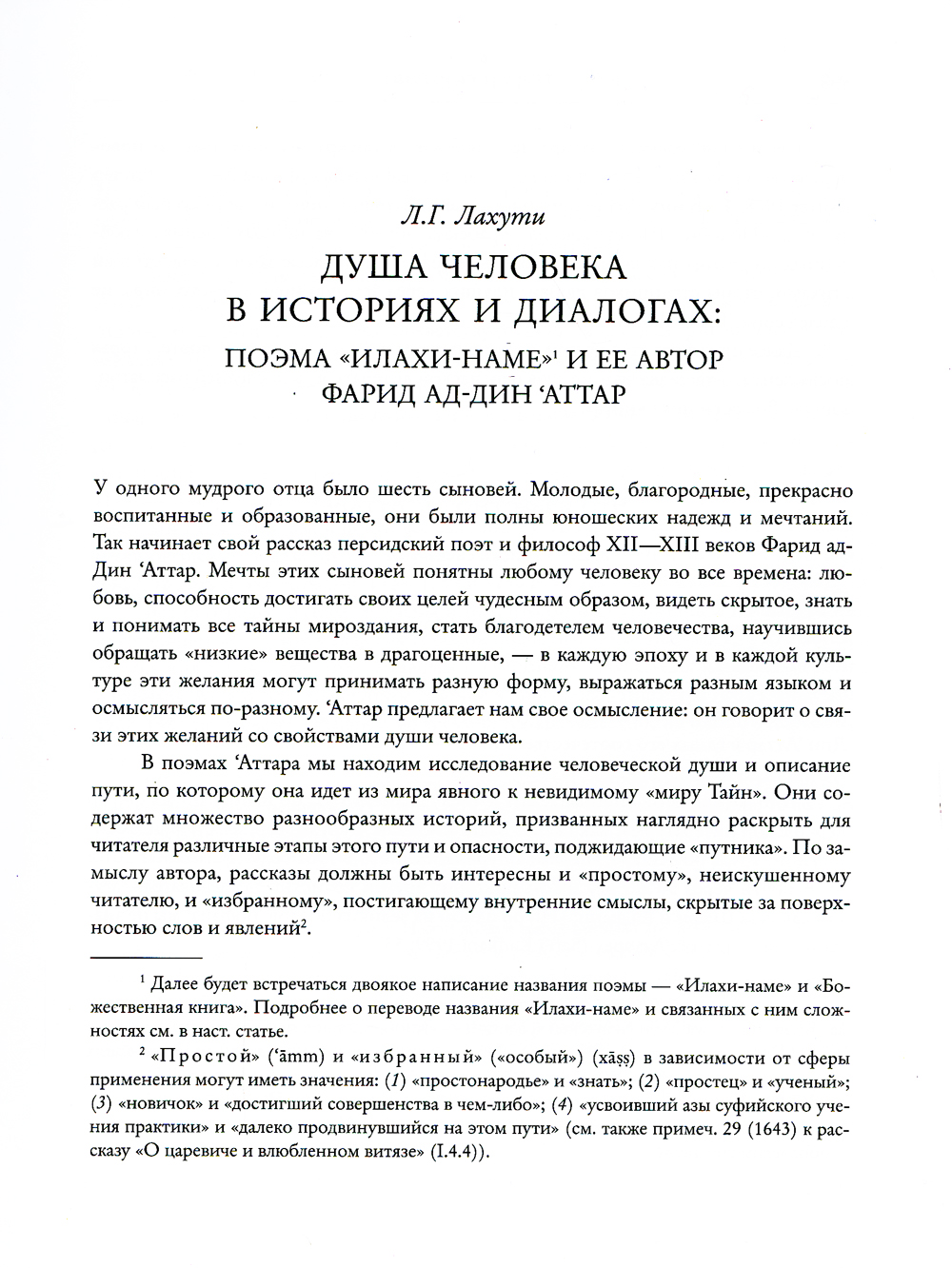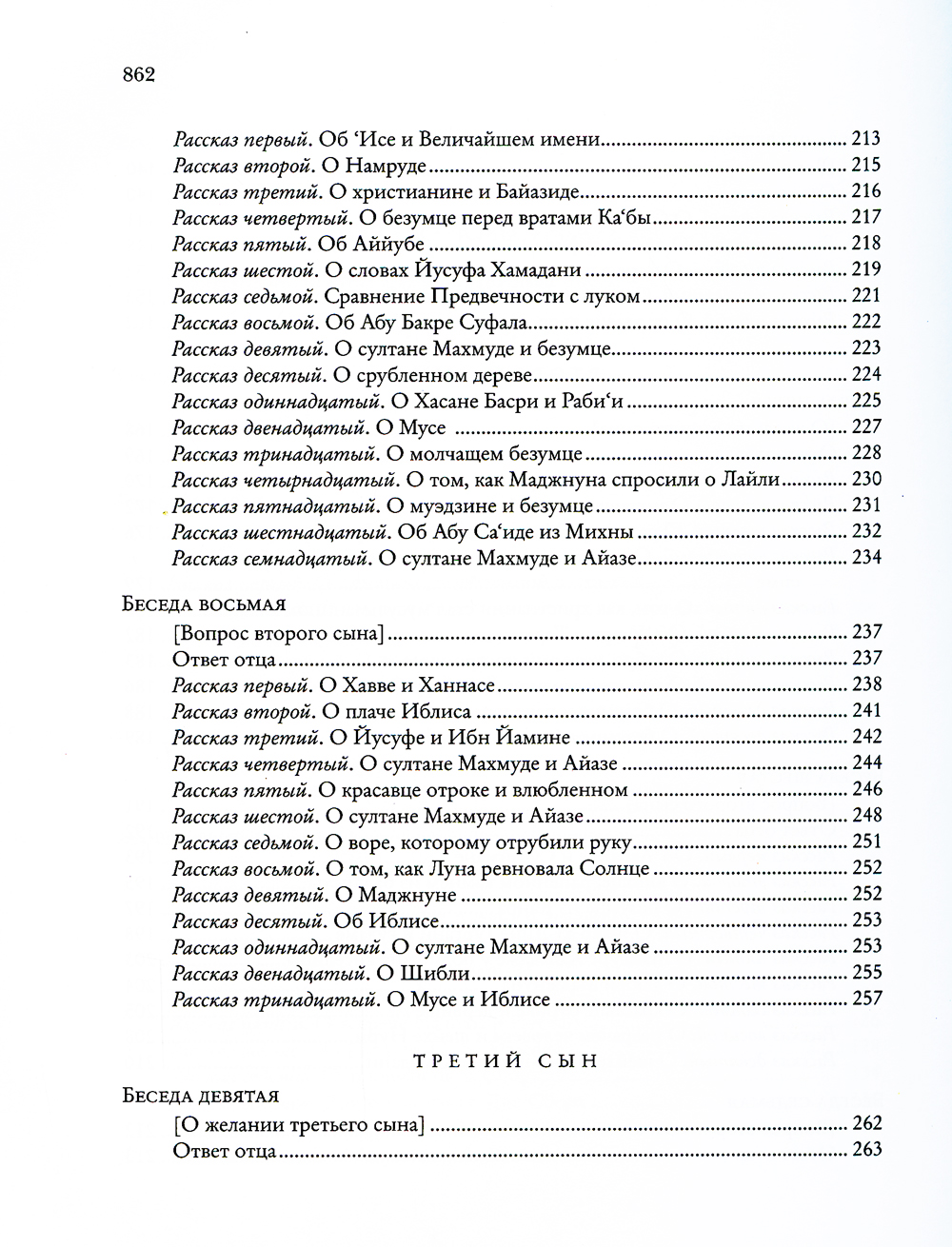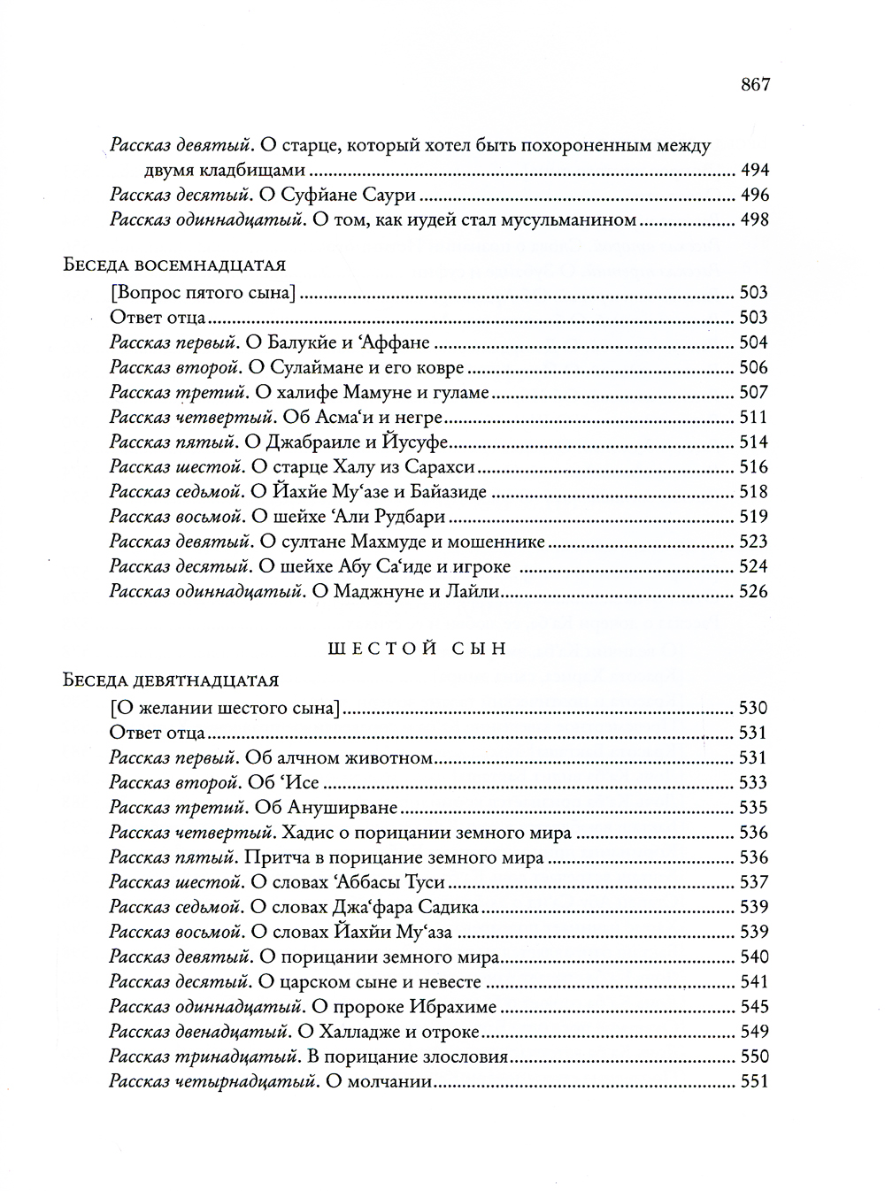 «Божественная книга» («Илахи-наме»), впервые публикуемая на русском языке, - несомненный шедевр, подлинная жемчужина в сокровищнице мировой литературы. Ее автор - персидский поэт-мистик, рассказчик и философ XII-XIII веков Фарид ад-Дин по прозванию 'Аттар («аптекарь», «парфюмер»). Он составлял целебные благовония и лечил ими людей, а благоухание его стихов, как говорили другие поэты, пронизало всю последующую персидскую поэзию. Его творчество оказало мощное и продолжительное влияние на развитие литературы в Иране и далеко за его пределами. Так, знаменитый Джалал ад-Дин Руми, поэт XIII века, называл 'Аттара своим вдохновителем, а себя - его «прислужником в искусстве слова». В центре внимания поэта - Бог, мир и человек в их взаимоотношениях. С читателем он говорит не языком поучений, но посредством искусно выстроенных рассказов. ...У одного мудрого отца было шесть сыновей. Молодые, благородные, прекрасно воспитанные и образованные, они были полны юношеских надежд и мечтаний, понятных любому человеку во все времена: любовь, способность достигать своих целей чудесным образом, видеть скрытое, знать и понимать все тайны мироздания, стать благодетелем человечества, научившись обращать «низкие» вещества в драгоценные. 'Аттар предлагает нам свое осмысление этих желаний: он говорит об их связи со свойствами души человека. Сыновья открываются отцу в своих желаниях, а тот в ответ начинает рассказывать им многочисленные увлекательные истории. Герои этих историй разнообразны: это исторические и литературные персонажи, знаменитые цари и безымянные старушки, купцы, прекрасные женщины и не менее прекрасные юноши, святые подвижники, воины, пророки, мусульмане, христиане, зороастрийцы, ангелы, пророки, небесные светила, собаки, кошки, муравьи и неодушевленные предметы. По замыслу автора, рассказы должны быть интересны и «простому», неискушенному, читателю, и «избранному», постигающему внутренние смыслы, скрытые за поверхностью слов и явлений. Отец в поэме 'Аттара ведет сыновей - а вместе с ними и читателей - дорогой смыслов. По мере этого восхождения человек изменяется: он начинает понимать, что вещи, которые казались ему простыми, таят в себе загадку. Загадка есть уже и в самом названии «Илахи-наме»: «Божественная книга» - наподобие «Божественной Комедии» Данте, «Книга, посвященная Божеству» или «Книга воззвания к Богу!» - все эти понимания допускает персидский язык. Рассказы-притчи 'Аттара открывают широкий простор для истолкования. Прочитываемые в суфийском ключе, они позволяют увидеть в занимательных сюжетах неистощимого рассказчика описание духовного пути мистика. Автор как бы задает читателю - а быть может, и самому себе - судьбоносные вопросы, ответ на которые не так прост. Сюжеты для своих историй 'Аттар черпал отовсюду - из повседневной жизни, из рассказов покупателей и пациентов, приходивших в его аптечную лавку, из историй о святых людях, которыми он восхищался еще в детстве, из множества книг, устных преданий и сказок. В разделе «Дополнения» собраны источники рассказов, которые удалось обнаружить. Это дает возможность представить круг чтения автора и увидеть, как преломляются в его творчестве известные сюжеты. Научный аппарат настоящего издания включает обстоятельную статью и фундаментальные комментарии, призванные помочь читателю прео