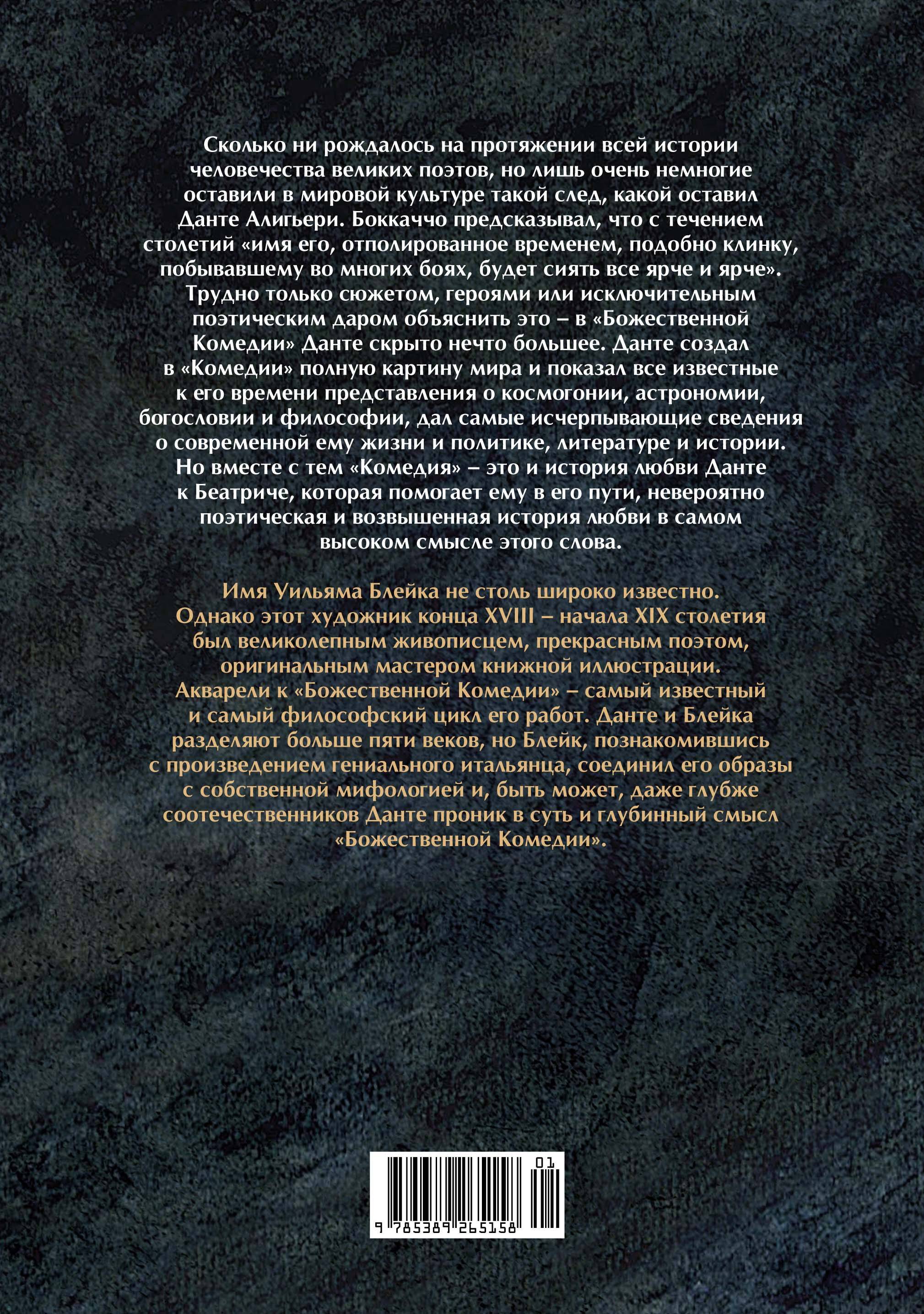 "Божественная комедия" Данте входит в ряд немногих поистине энциклопедических произведений мировой литературы. Следуя пути Данте и Вергилия, мы узнаём о жизни Италии рубежа XIII и XIV веков, получаем сведения о литературе, мифологии и космогонии, но также мы находим в "Комедии" и поэтические описания любви, прекрасные строки, посвященные природе и философские размышления о жизни. Спустя пять столетий с момента публикации "Комедии", английский художник Уильям Блейк создал иллюстрации, в полной мере позволяющие прочувствовать глубину этого произведения. Его акварели выходят за рамки изображения эпизодов поэмы Данте в область мифологии и осмысления бытия. Глубже и полнее читаются бессмертные строки великого итальянца в сочетании с акварелями гениального английского мастера.| Издательство | Азбука-Аттикус Издат.группа ООО |