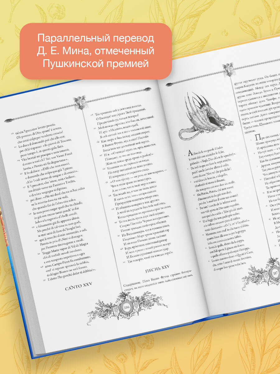 "Божественная комедия" - это величайший памятник мировой литературы, в котором представлен синтез всей европейской средневековой культуры и смелых новаторских идей. В поисках истинного пути Данте отправляется в грандиозное путешествие через тьму и скорбь Ада, полное печали и надежд Чистилище к ослепительному Раю. Изучая в загробном мире судьбу грешных, оступившихся и праведных душ, Данте постепенно обретает силы для духовного возрождения и находит ответы на вечные вопросы бытия. В настоящем издании оригинальный текст всей "Божественной комедии" приводится с параллельным переводом Д. Е. Мина, отмеченным Пушкинской премией, и сопровождается взятыми в рамку выразительными иллюстрациями выдающегося художника-графика Гюстава Доре. На обложке использован фрагмент картины "Мистическое Рождество" итальянского живописца эпохи Возрождения Сандро Боттичелли. Для удобства чтения каждая строка на русском языке стоит напротив соответствующей строки на итальянском. Параллельно расположенный текст позволит без труда сравнивать оригинал с переводом, обращать внимание на трудности, с которыми сталкивался переводчик, и отмечать наиболее точно переведенные фрагменты. Твердый переплет с золотым тиснением, богато украшенный текст с легкой стилизацией под средневековую книгу, иллюстрации, золотистая лента ляссе добавляют книге изысканность. Ее можно приобрести не только для своей коллекции, но и в качестве подарка дорогим и близким людям.| Издательство | ИЗДАТЕЛЬСТВО "АСТ" |