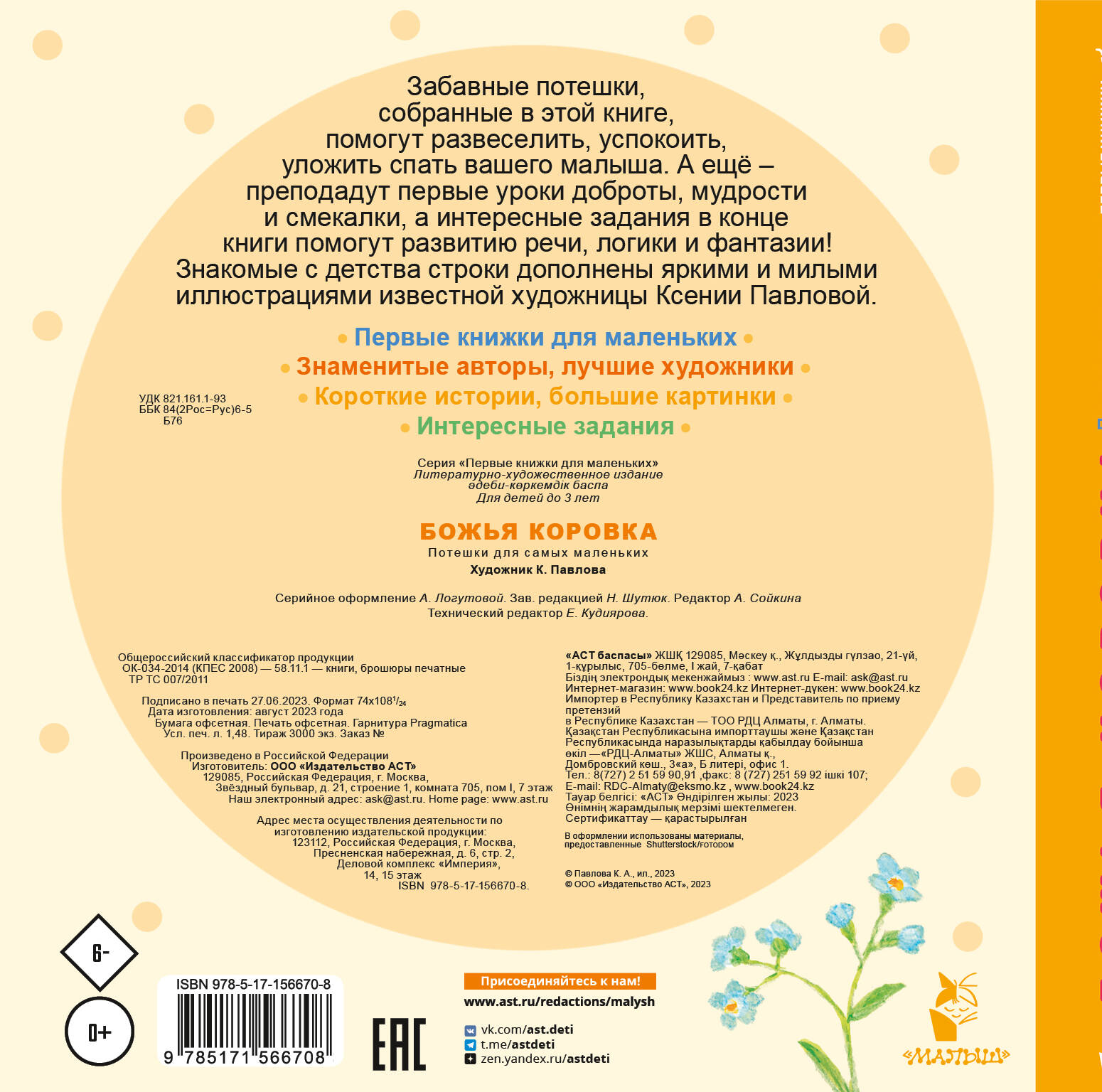 Забавные потешки, собранные в этой книге, помогут развеселить, успокоить, уложить спать вашего малыша. А ещё - преподадут первые уроки доброты, мудрости и смекалки, а интересные задания в конце книги помогут развитию речи, логики и фантазии! Знакомые с детства строки дополнены яркими и милыми иллюстрациями известной художницы Ксении Павловой.| Издательство | ИЗДАТЕЛЬСТВО "АСТ" |