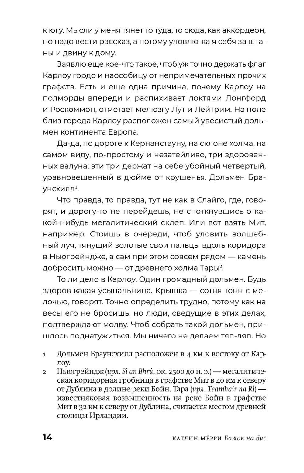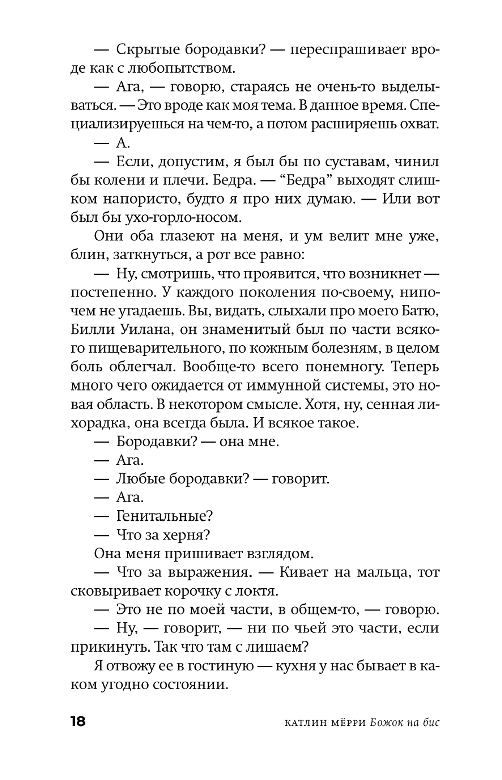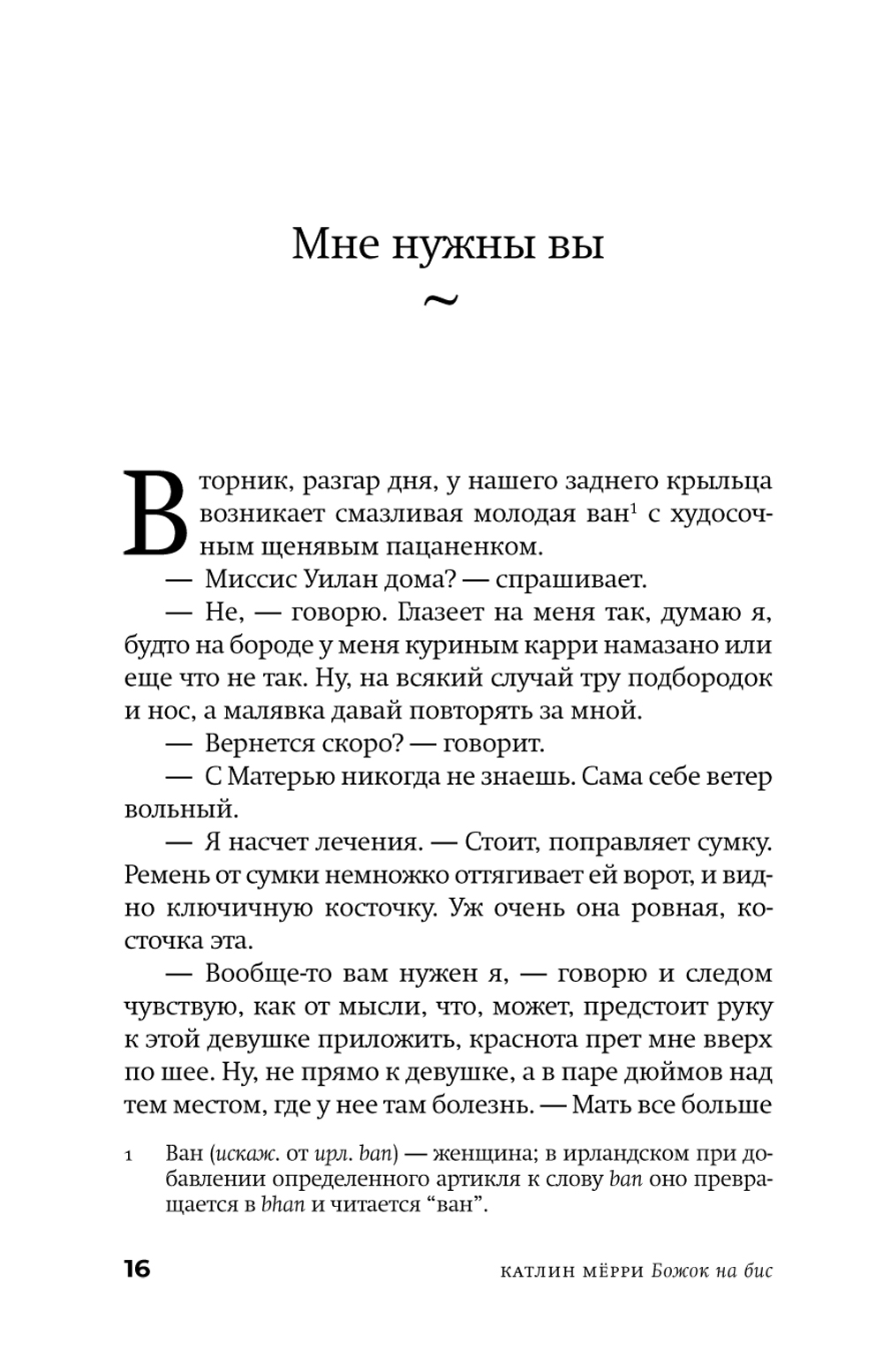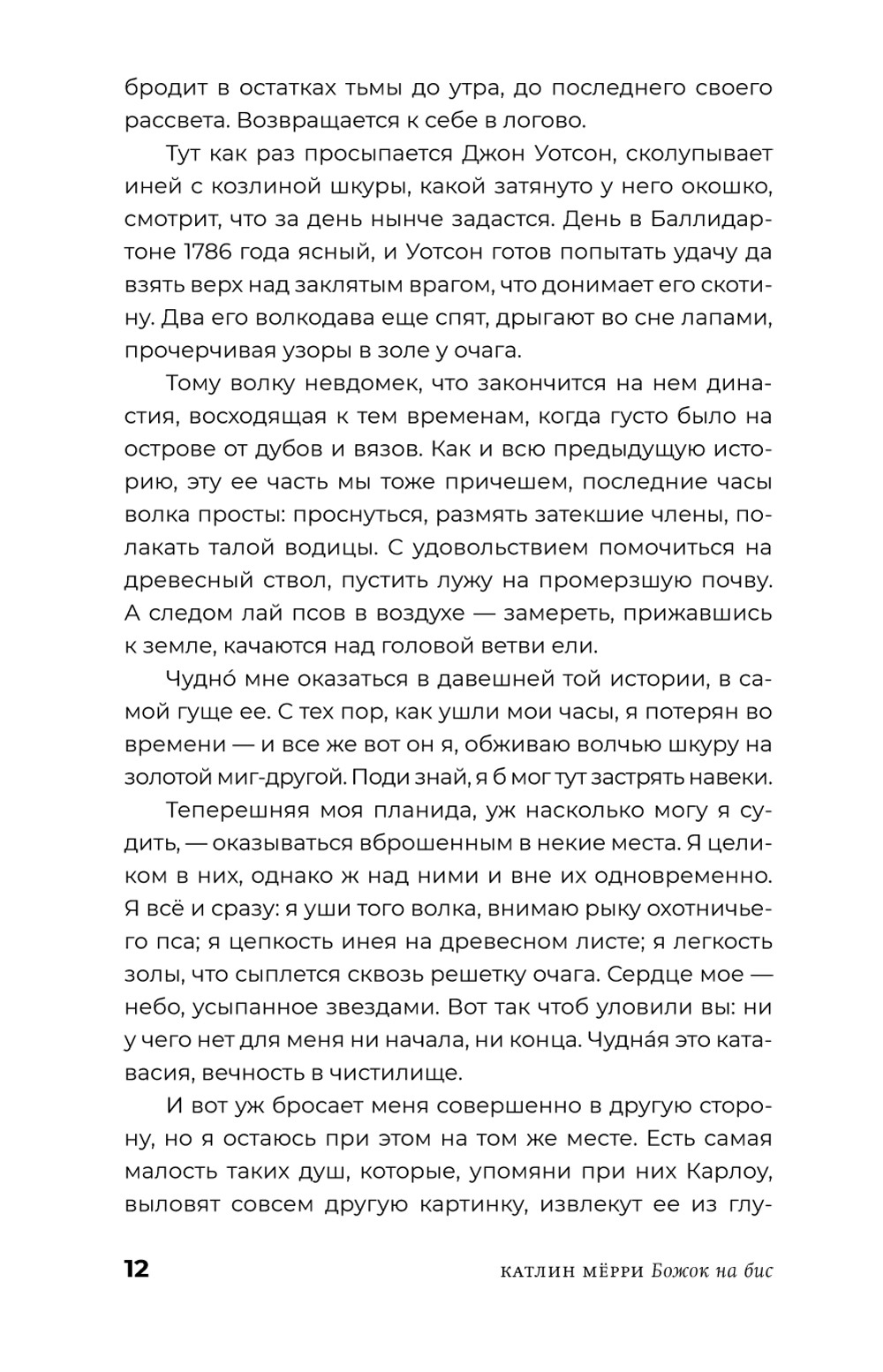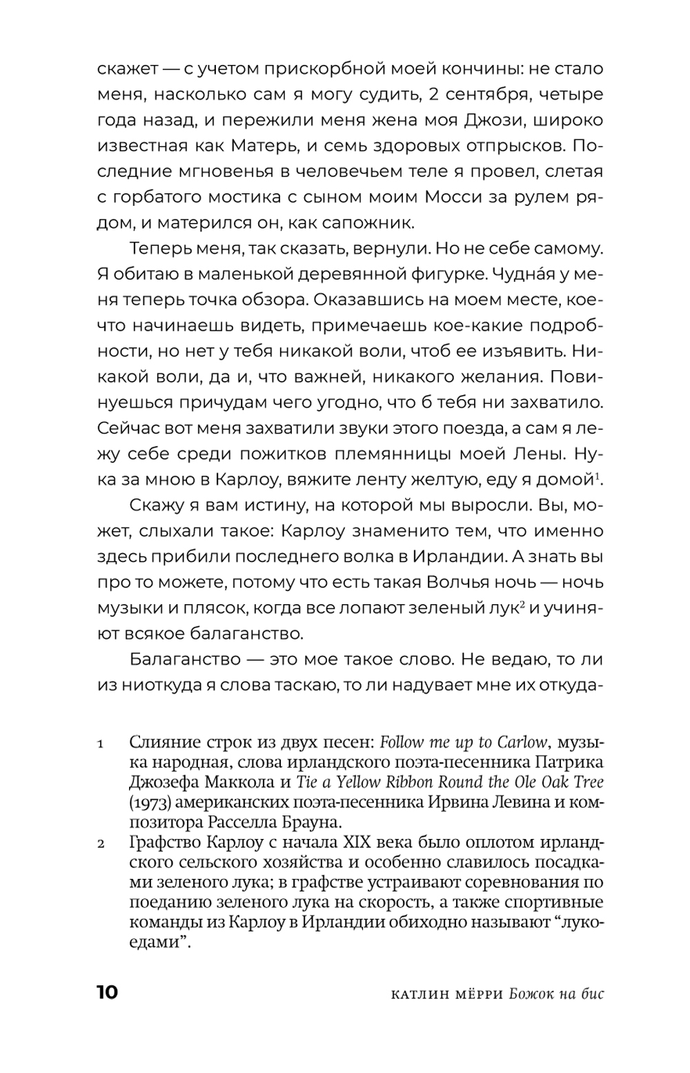 Седьмой сын седьмого сына, Фрэнк Уилан с нетерпением ждет, когда целительский дар, переданный ему отцом, тоже седьмым сыном седьмого сына, явит себя в полную силу. Династия Уиланов и в наши дни славится этим даром не только в Карлоу и его окрестностях, но и в соседних ирландских графствах. Однако в большой семейной истории и всяких загадок бывает немало, и Фрэнку, чтобы разобраться с собственным призванием и кое-какими личными пунктиками, предстоит сперва поискать ключи от родовых тайн - в чудных местах, диковинными способами и с помощью старых и новых друзей. У Катлин Мёрри получилась та самая Ирландия, по- прежнему пропитанная старой магией и населенная чудаками и мудрецами, какую так любят по всему миру, в которую стремятся попасть, приезжая на остров, бесчисленные поклонники всего ирландского. Живые непосредственные голоса ирландской глубинки, дороги в холмах и над морем, предельно тонкая граница между живыми и мертвыми, говорящий и поющий мир вроде бы неприметных мелочей - во все это «Божок на бис» погружает нас с первых же страниц. Катлин Мёрри, мастерски ведя все сольные партии в этом необычайно музыкальном романе, приглашает пережить бесшабашное приключение, в котором зачарованные окольные шоссе и проселки Ирландии ведут и героев, и читателей вглубь времени - и в их собственную глубину.