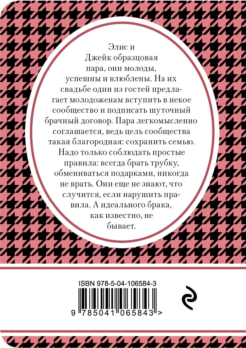 Элис и Джейк образцовая пара, они молоды и успешны. В их жизни все замечательно, они влюблены друг в друга и празднуют роскошную свадьбу, на которой один из гостей предлагает молодоженам вступить в некое сообщество и подписать шуточный брачный договор. И счастливые возлюбленные легкомысленно соглашаются, ведь цель сообщества так замечательна: сохранить семью, пока смерть не разлучит… и так далее. Всего-то надо выполнять простые правила: всегда брать трубку, когда звонит супруг, обмениваться подарками, быть внимательными и терпеливыми, никогда не врать. Но только Элис и Джейка никто не предупредил, что случится, если кто-то из них нарушит правила. А ошибки неизбежны, никто из нас не идеален, правда?| Издательство | ООО "Издательство "Эксмо" |