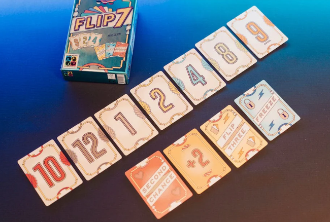 «Flip 7» - карточная игра‑соревнование, где игроки собирают карты и решают: выйти из раунда с сохранёнными очками или рискнуть и продолжить, чтобы заработать бонус за семь разных карт. Игра сочетает быструю реакцию, стратегию и элемент риска.