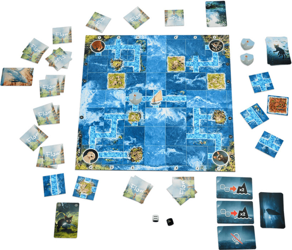 «Flow» - кооперативная настольная игра, где игроки помогают коту и его друзьям добраться до лодки. Для этого размещаются фишки и карты действий, создавая безопасный путь. Игра проходит в реальном времени, развивает быстрое мышление и умение принимать решения.