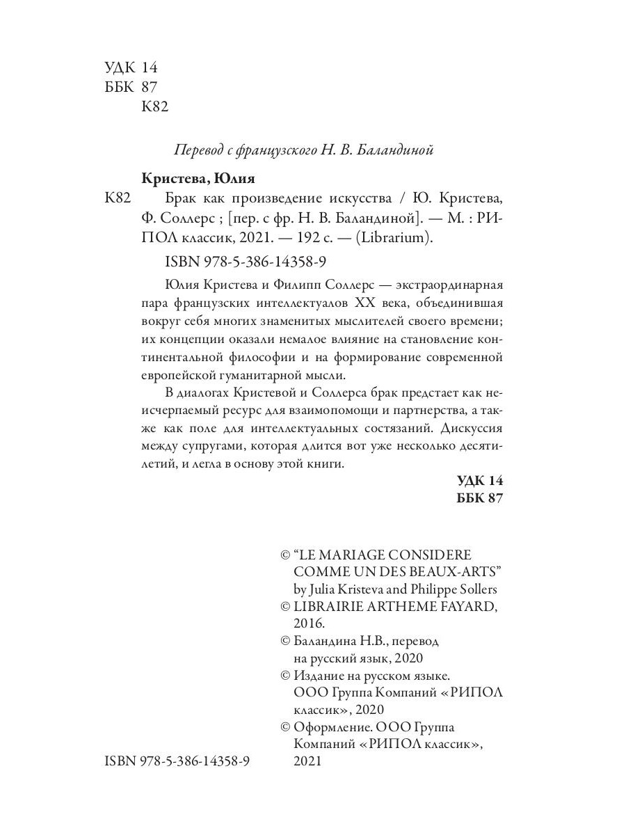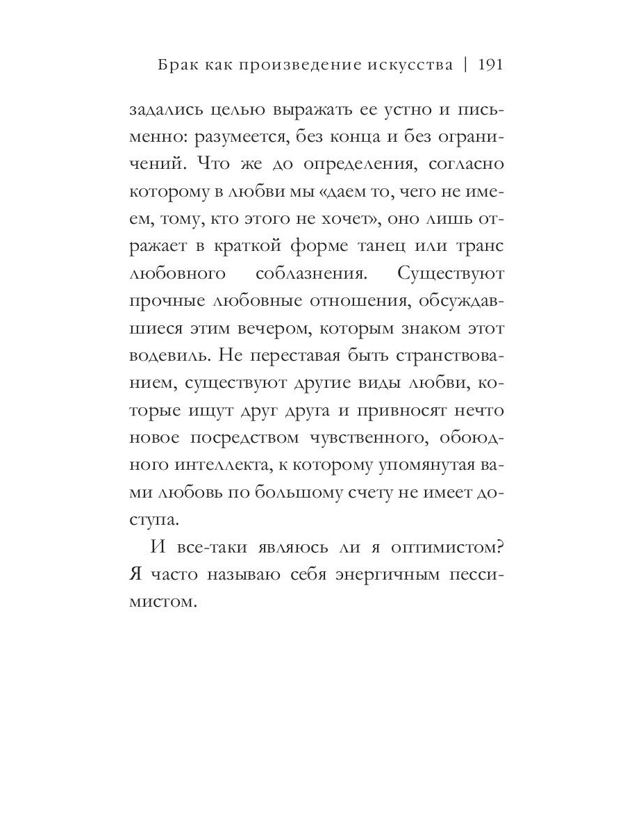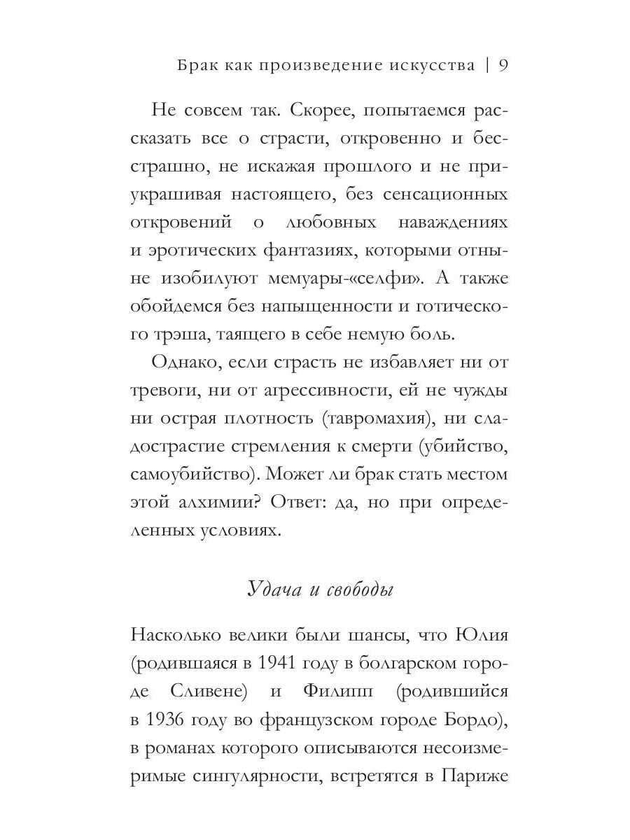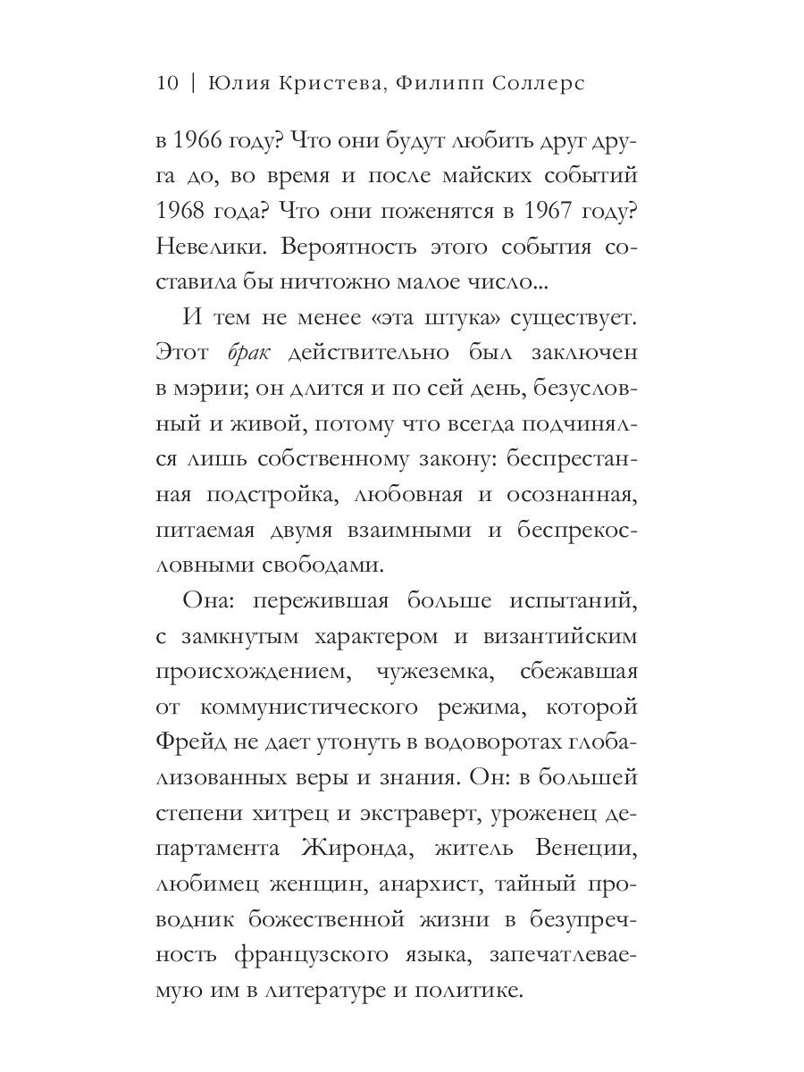 В диалогах Кристевой и Соллерса брак предстает как неисчерпаемый ресурс для взаимопомощи и партнерства, а также как поле для интеллектуальных состязаний. Дискуссия между супругами, которая длится вот уже несколько десятилетий, и легла в основу этой книги.