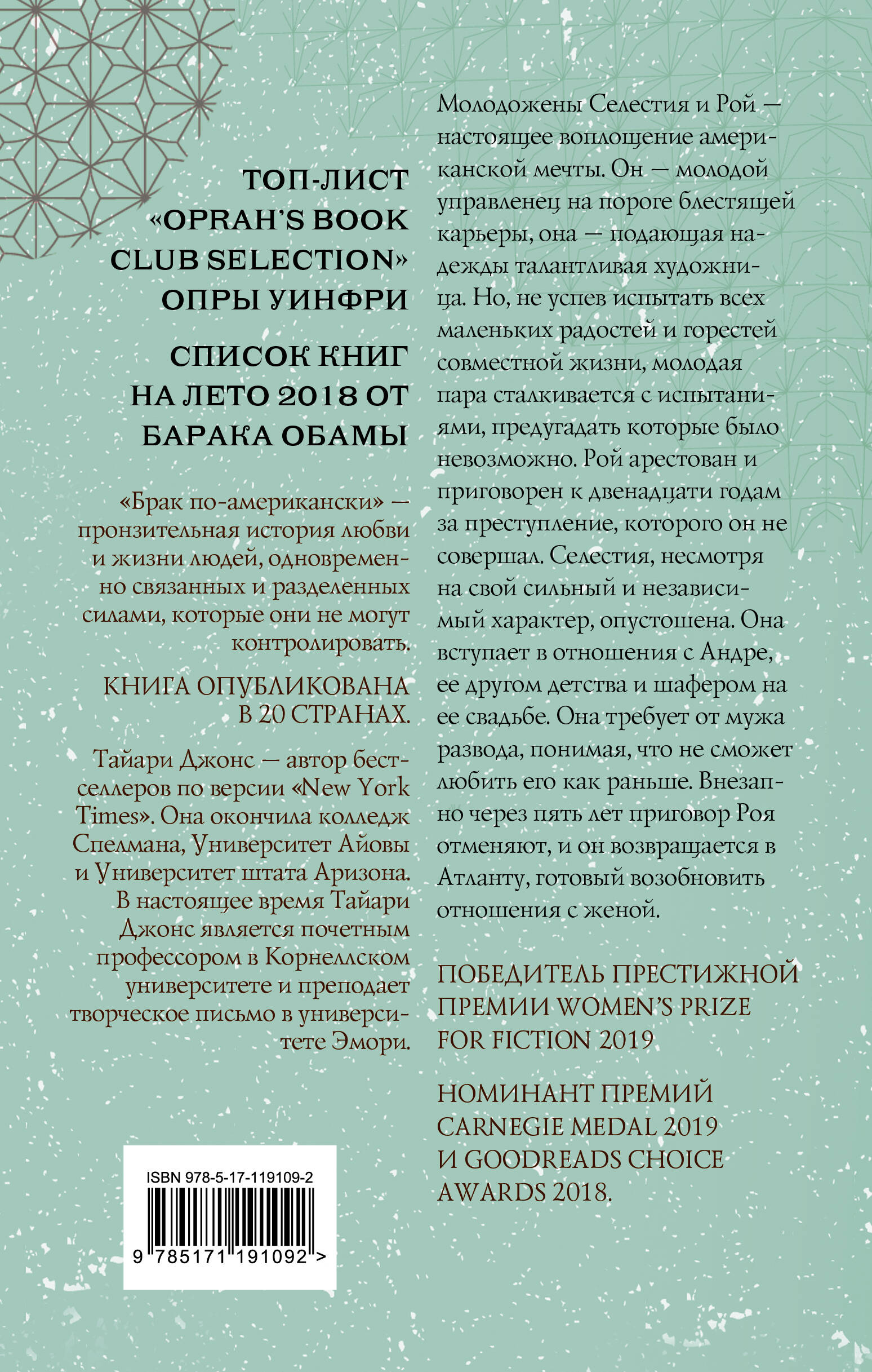 Молодожены Селестия и Рой - настоящее воплощение американской мечты. Он - молодой управленец на пороге блестящей карьеры, она - подающая надежды талантливая художница. Но, не успев испытать всех маленьких радостей и горестей совместной жизни, молодая пара сталкивается с испытаниями, предугадать которые было невозможно. Рой арестован и приговорен к двенадцати годам за преступление, которого он не совершал. Селестия, несмотря на свой сильный и независимый характер, опустошена. Она вступает в отношения с Андре, ее другом детства и шафером на ее свадьбе. Она требует от мужа развода, понимая, что не сможет любить его как раньше. Внезапно через пять лет приговор Роя отменяют, и он возвращается в Атланту, готовый возобновить отношения с женой. "Брак по-американски" - пронзительная история любви и жизни людей, одновременно связанных и разделенных силами, которые они не могут контролировать.| Издательство | ИЗДАТЕЛЬСТВО "АСТ" |