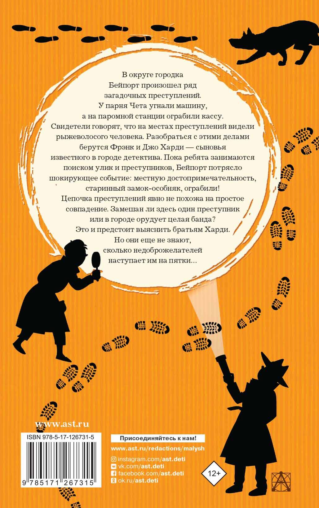 Детективные истории про братьев Харди впервые появились в США и стали настоящим литературным событием ХХ века: захватывающий сюжет, где переплетаются расследования и загадки, раскрытие преступлений, опасность и риск, уже с первых страниц овладевают вниманием читателя и держат в напряжении до конца книги. Истории про юных детективов братьев Харди написали те же авторы, которые придумали знаменитую сыщицу Нэнси Дрю. По мотивам книг про братьев Харди были сняты сериалы, сделаны компьютерные игры. На сегодняшний день у этих детективных историй есть поклонники по всему миру. В книге "Братья Харди и сокровища башни" Фрэнку и Джо Харди придется расследовать сразу несколько дел. У их друга Чета угнали машину, а на паромной станции ограбили кассу. Свидетели говорят, что на месте преступлений был замечен рыжеволосый человек. Пока детективы Харди занимаются выяснением обстоятельств, при которых были совершены преступления, случается ещё одно событие, потрясшее весь город: местную достопримечательность, неприступный замок-особняк, ограбили! Замешан ли здесь тот же рыжеволосый незнакомец, или же в округе орудует целая банда преступников? Для среднего школьного возраста.| Издательство | Издательство "АСТ" |