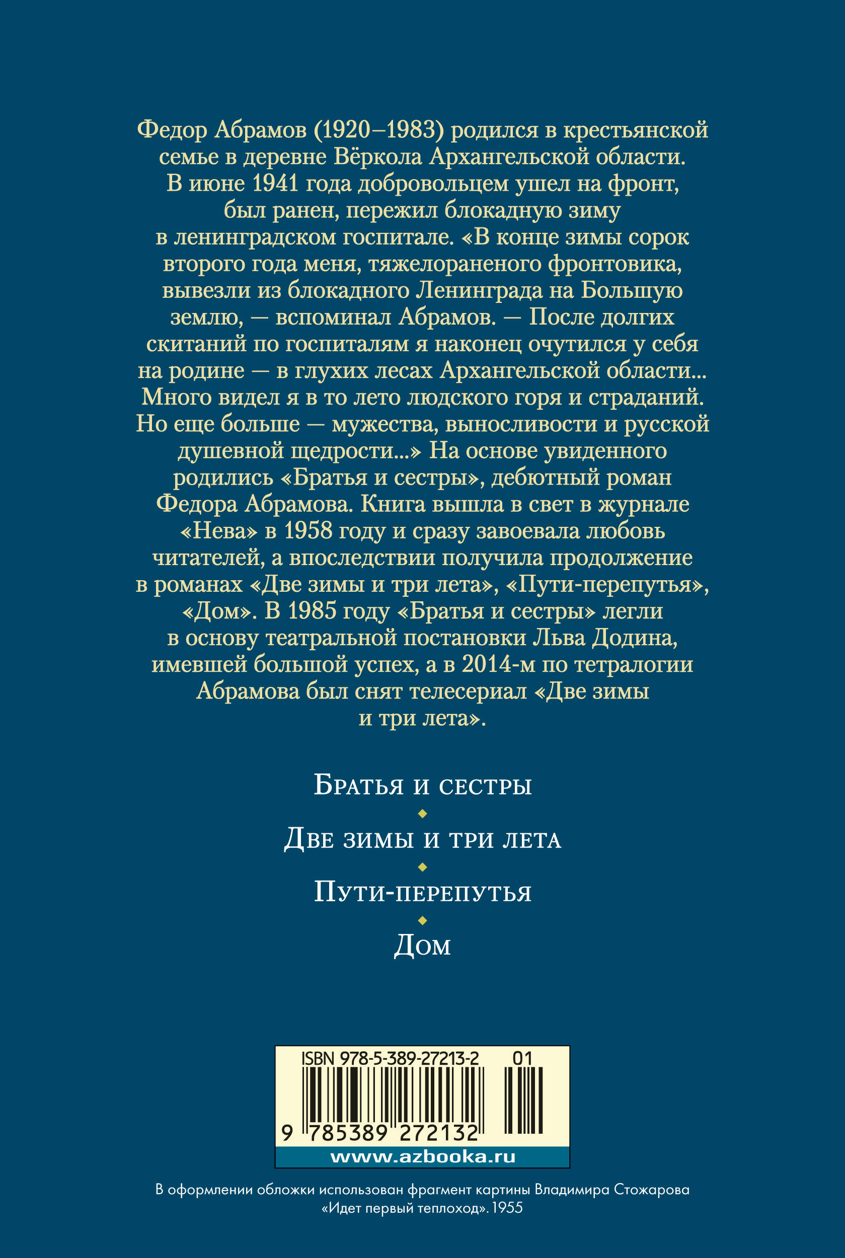 Федор Абрамов (1920-1983) родился в крестьянской семье в деревне Вёркола Архангельской области. В июне 1941 года добровольцем ушел на фронт, был ранен, пережил блокадную зиму в ленинградском госпитале. "В конце зимы сорок второго года меня, тяжелораненого фронтовика, вывезли из блокадного Ленинграда на Большую землю, - вспоминал Абрамов. - После долгих скитаний по госпиталям я наконец очутился у себя на родине - в глухих лесах Архангельской области… Много видел я в то лето людского горя и страданий. Но еще больше - мужества, выносливости и русской душевной щедрости…" На основе увиденного родились "Братья и сестры", дебютный роман Федора Абрамова. Книга вышла в свет в журнале "Нева" в 1958 году и сразу завоевала любовь читателей, а впоследствии получила продолжение в романах "Две зимы и три лета", "Пути-перепутья", "Дом".| Издательство | Азбука-Аттикус Издат.группа ООО |