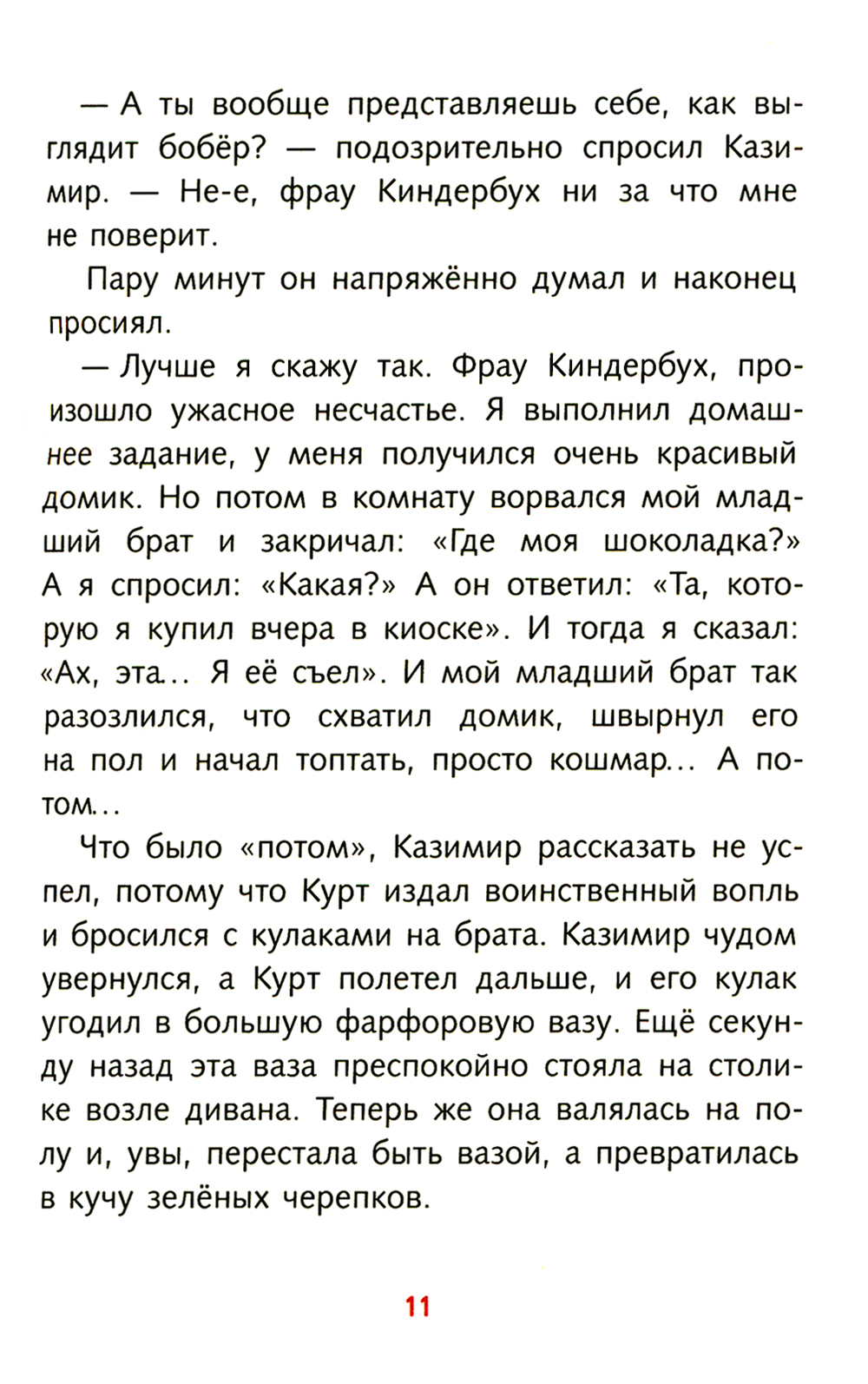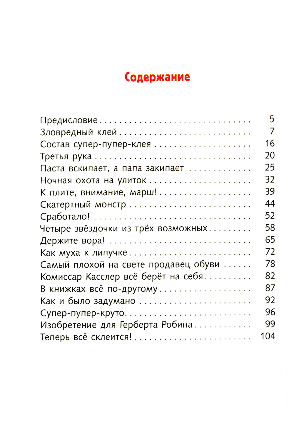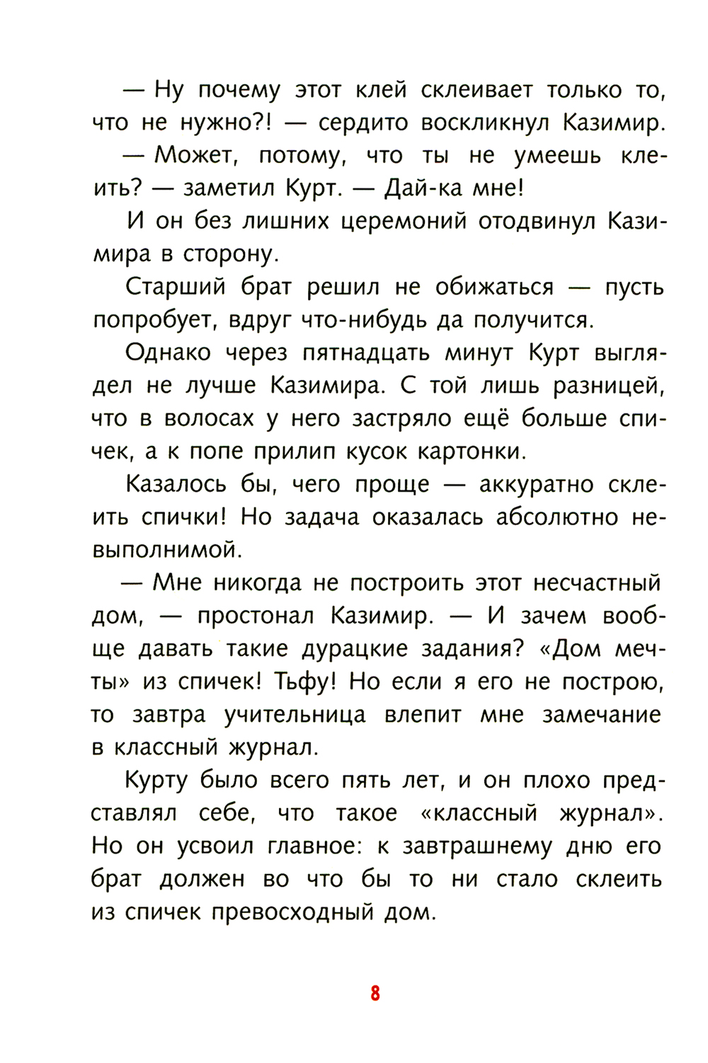 Казимир и его младший брат Курт очень любят изобретать разные нужные и полезные вещи. Они уже придумали сверхскоростной беспедальный велосипед, ванну для купания без воды и приспособление под названием «третья рука». А с помощью своей новейшей разработки - супер-пупер-клея, сваренного из карамелек, жвачки и улиточной слизи - им даже удалось поймать грабителя.| Издательство | Мелик-Пашаев |
