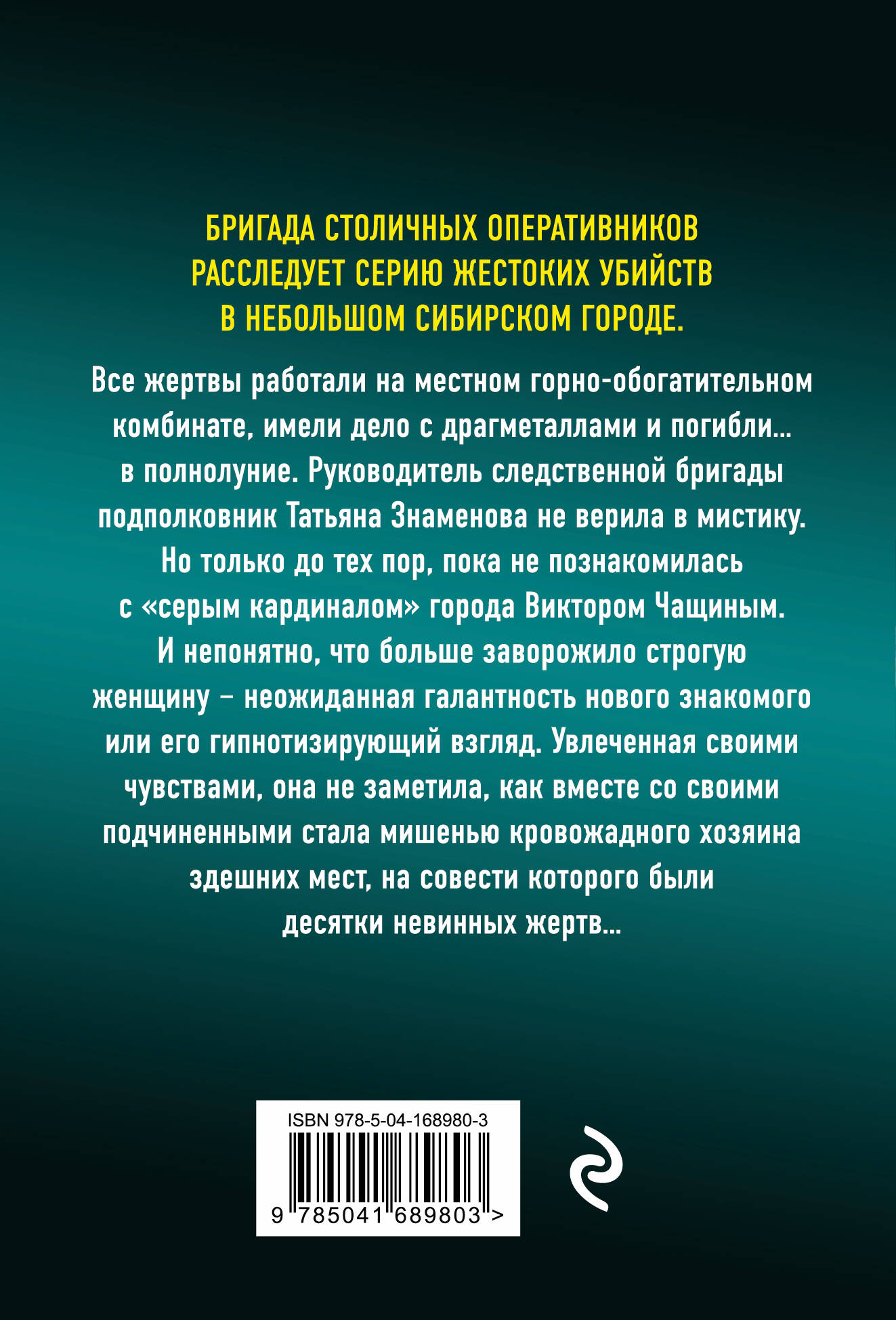 Бригада столичных оперативников расследует серию жестоких убийств в небольшом сибирском городе. Все жертвы работали в местном горно-обогатительном комбинате, имели дело с драгметаллами и погибли… в полнолуние. Руководитель следственной бригады подполковник Татьяна Знаменова не верила в мистику. Но только до тех пор, пока не познакомилась с «серым кардиналом» города Виктором Чащиным. И непонятно, что больше заворожило строгую женщину - неожиданная галантность нового знакомого или его гипнотизирующий взгляд. Увлеченная своими чувствами, она не заметила, как вместе со своими подчиненными стала мишенью кровожадного хозяина здешних мест, на совести которого были десятки невинных жертв…| Издательство | ООО "Издательство "Эксмо" |