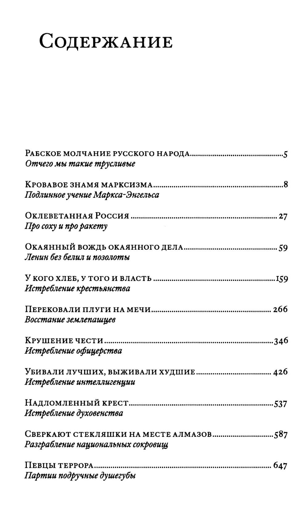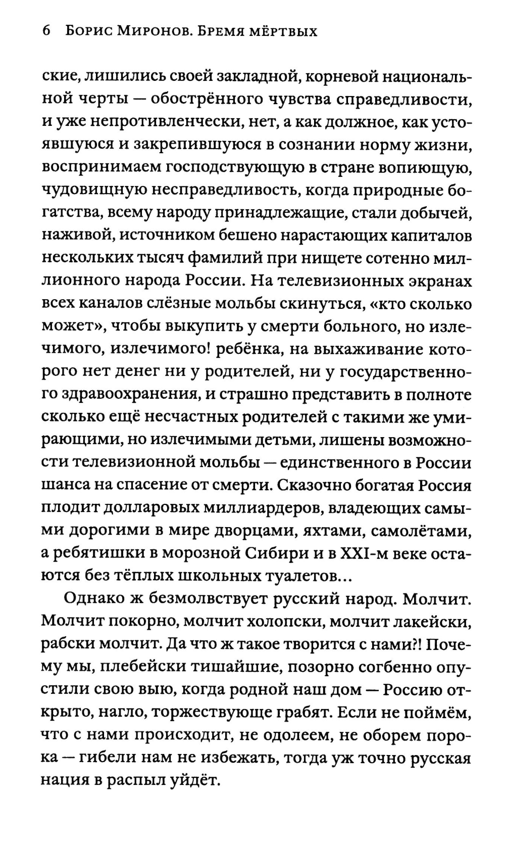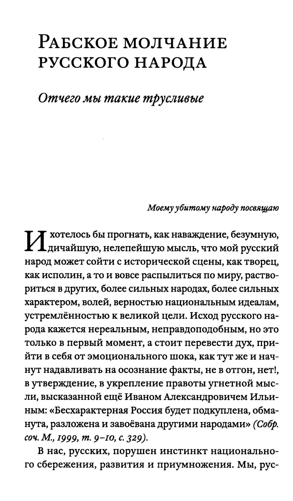 Хотелось бы прогнать, как наваждение, безумную, дичайшую, нелепейшую мысль, что мой русский народ может сойти с исторической сцены, как творец, как исполин, а то и вовсе распылиться по миру, раствориться в других, более сильных народах, более сильных характером, волей, верностью национальным идеалам, устремлённостью к великой цели. Исход русского народа кажется нереальным, неправдоподобным, но это только в первый момент, а стоит перевести дух, прийти в себя от эмоционального шока, как тут же и начнут надавливать на осознание факты, не в отгон, нет!, в утверждение, в укрепление правоты угнетной мысли, высказанной ещё Иваном Александровичем Ильиным: «Бесхарактерная Россия будет подкуплена, обманута, разложена и завоёвана другими народами». В нас, русских, порушен инстинкт национального сбережения, развития и приумножения. Мы, русские, лишились своей закладной, корневой национальной черты - обострённого чувства справедливости, и уже непротивленчески, нет, а как должное, как устоявшуюся и закрепившуюся в сознании норму жизни, воспринимаем господствующую в стране вопиющую, чудовищную несправедливость, когда природные богатства, всему народу принадлежащие, стали добычей, наживой, источником бешено нарастающих капиталов нескольких тысяч фамилий при нищете сотенно миллионного народа России. Русский человек в нищете, голоде, в бесправном положении, телемагнаты же убеждают его в обратном и, самое удивительное, он верит им, вернее, хочет верить, так легче ему переносить тягостное бремя жизни, когда страшно бороться за лучшую жизнь. Вот причина почему люди верят власти или хотят верить, или убеждают себя в том, что они верят, или верят в то, что они верят, потому что в противном случае надо сопротивляться, надо бороться, а это страшно. Страх, в коем проживает сегодня русский народ, страх всеохватный, страх парализующий ум, душу, рассудок, волю, даже инстинкт самосохранения сковавший. Такой страх, как тяжкое заболевание, требует исследования, как и любая другая болезнь, излечиться от которой возможно лишь поняв природу болезни.| Издательство | Книжный мир |