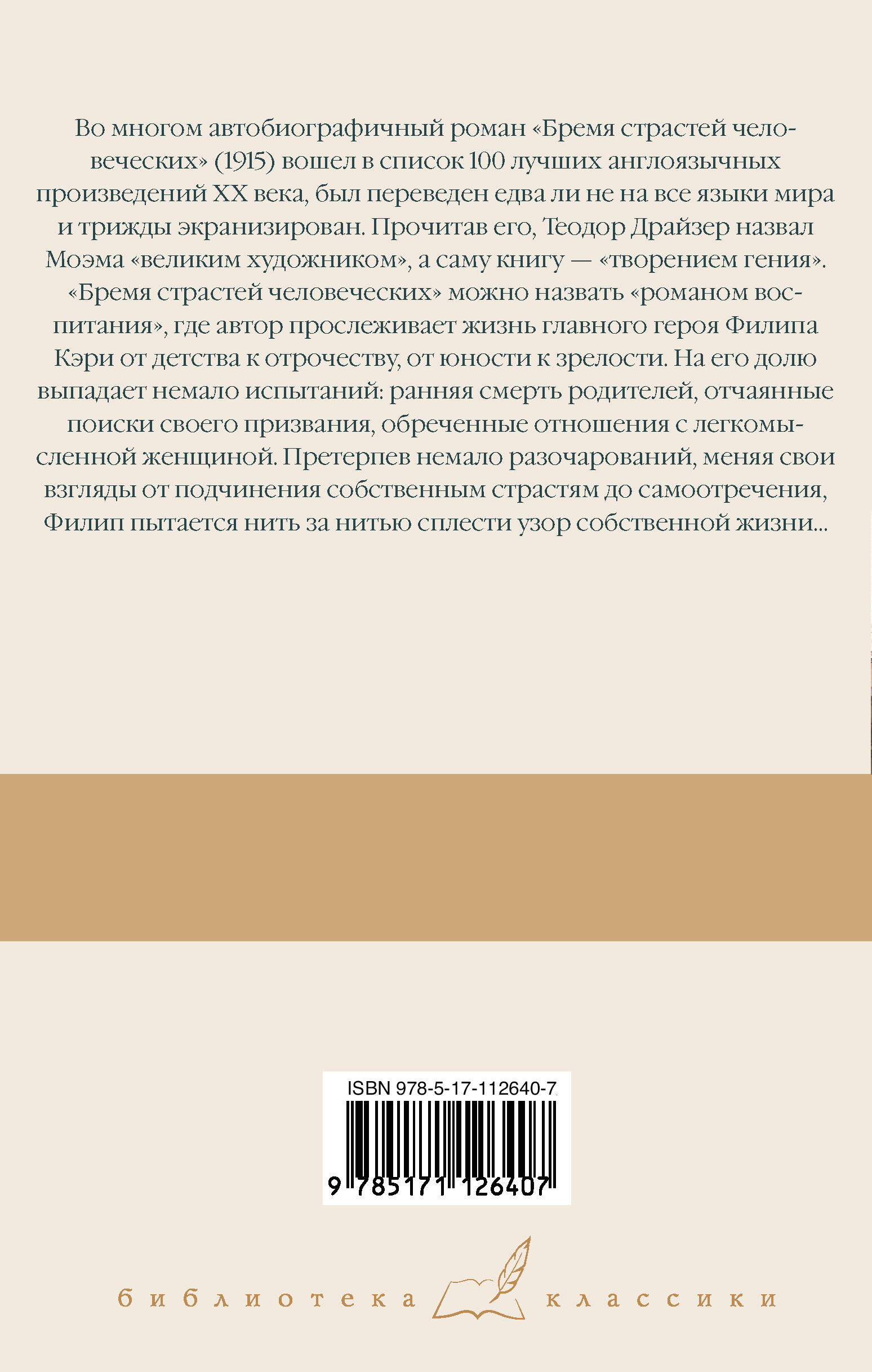 Во многом автобиографичный роман "Бремя страстей человеческих" (1915) вошел в список 100 лучших англоязычных произведений XX века, был переведен едва ли не на все языки мира и трижды экранизирован. Прочитав его, Теодор Драйзер назвал Моэма "великим художником", а саму книгу - "творением гения". "Бремя страстей человеческих" можно назвать "романом воспитания", где автор прослеживает жизнь главного героя Филипа Кэри от детства к отрочеству, от юности к зрелости. На его долю выпадает немало испытаний: ранняя смерть родителей, отчаянные поиски своего призвания, обреченные отношения с легкомысленной женщиной. Претерпев немало разочарований, меняя свои взгляды от подчинения собственным страстям до самоотречения, Филип пытается нить за нитью сплести узор собственной жизни…| Издательство | ИЗДАТЕЛЬСТВО "АСТ" |
