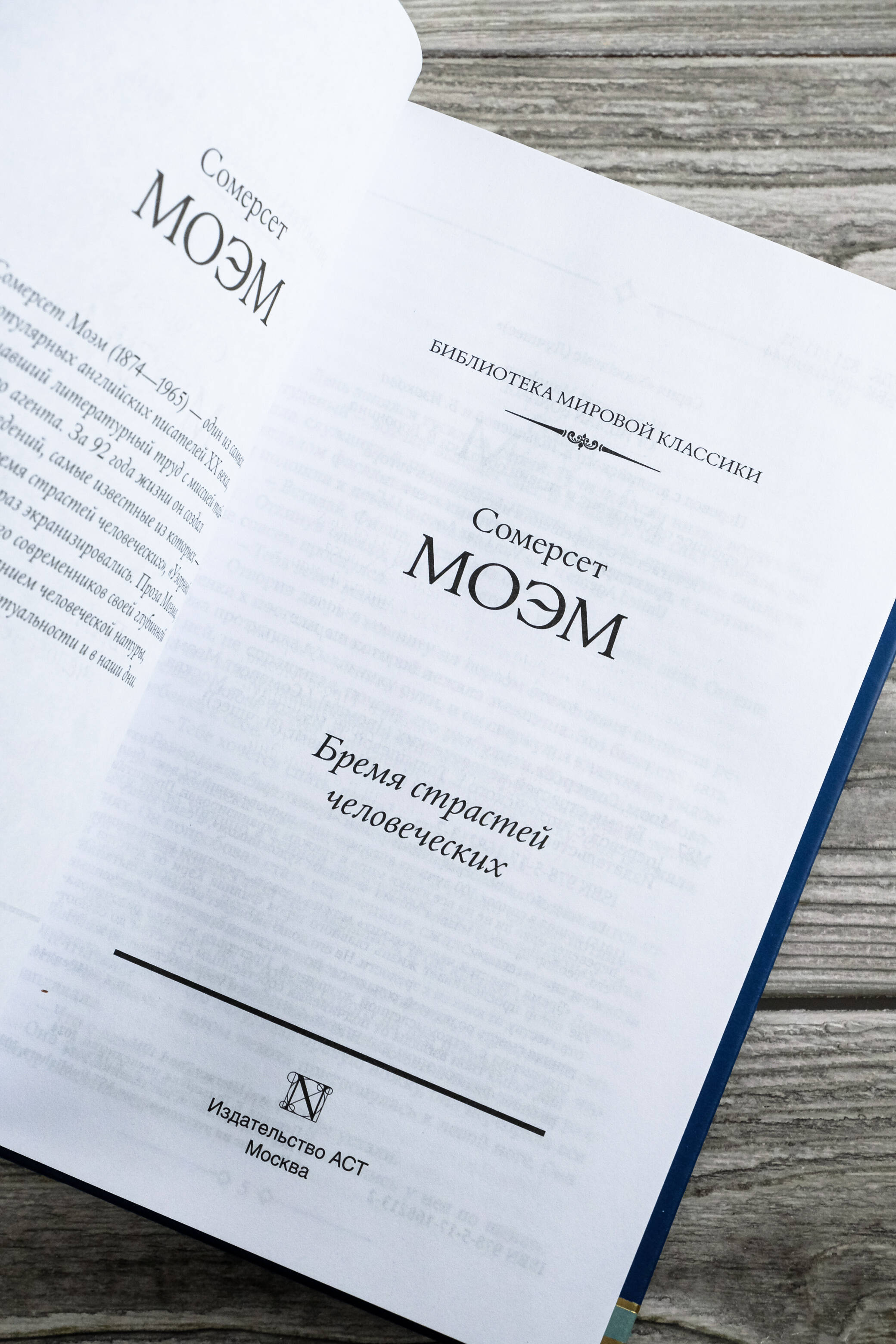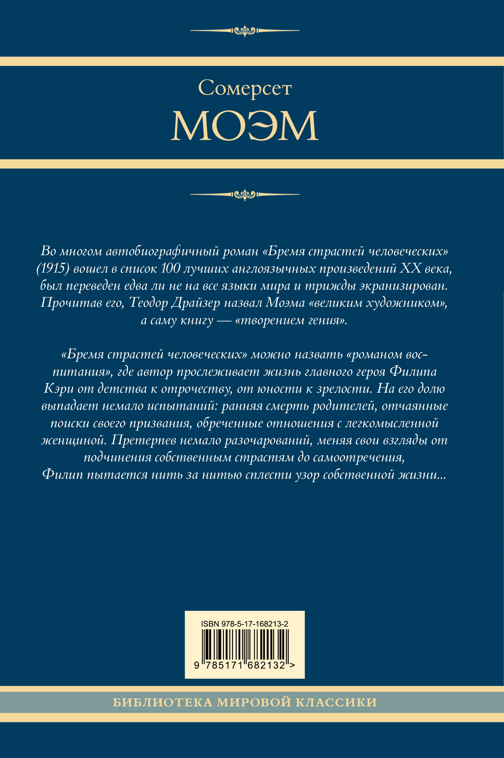 Во многом автобиографический роман Сомерсета Моэма «Бремя страстей человеческих» считается классическим романом воспитания. Главный герой книги, Филип Кэри, постепенно взрослеет и, несмотря на все выпавшие на его долю испытания, пытается найти свой собственный путь в жизни. «Бремя страстей человеческих» считается одним из лучших произведений Моэма. Роман входит в число 100 лучших англоязычных книг XX века по версии издательства Modern Library, книга переведена на все основные языки мира и трижды экранизирована.| Издательство | Издательство "АСТ" |