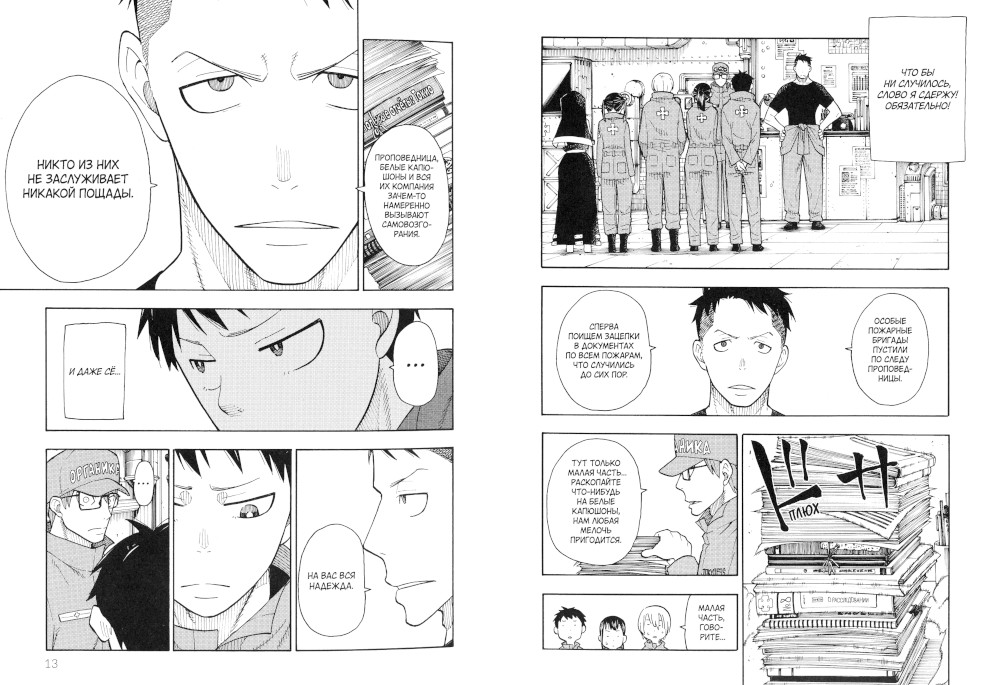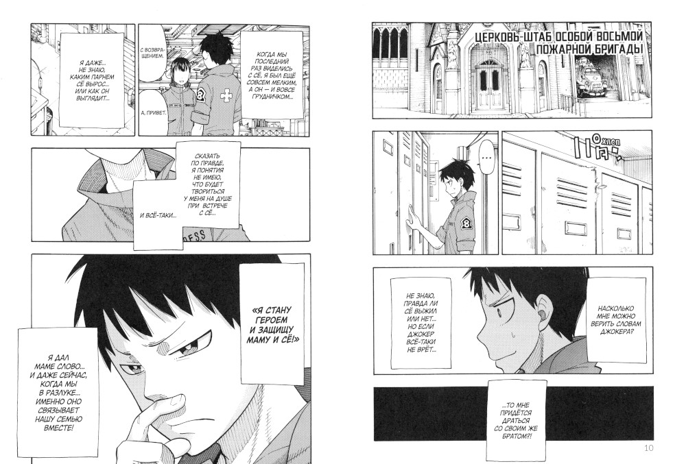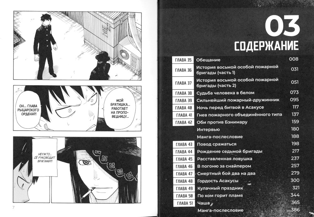 Твой младший брат жив. От загадочного Джокера Синра узнаёт, что его младший брат Сё вступил в ряды последователей Проповедницы. Сумеют ли принять это он и его товарищи по бригаде? Кроме того, становится известна и история основания восьмой бригады! Получив зацепку, которая может привести к Проповеднице, команда отправляется в Асакусу! Настало время бросить вызов седьмой бригаде! Иметь дело придётся с сильнейшим из пожарных! Арка Асакусы, славящейся пожарами и драками, начинается! Оби против Бэнимару! Финал битвы капитанов! Жуткая способность Белых Капюшонов порождает недоразумение за недоразумением, и обе стороны сталкиваются лбами! Чем закончится битва, в которой никто не желает отступать?! Врагов всё больше, и Асакуса погружается в хаос! Что делать восьмой бригаде, когда район объят пламенем, а Белые Капюшоны переходят в наступление?! Как теперь поступит седьмая бригада?! Какое решение найдёт Синра с друзьями?! На сцену выходит новый огневик! Синра раскрывает в себе пламя бездны! Кульминация жаркой арки Асакусы!| Издательство | Изд. Фантастика Книжный Клуб |