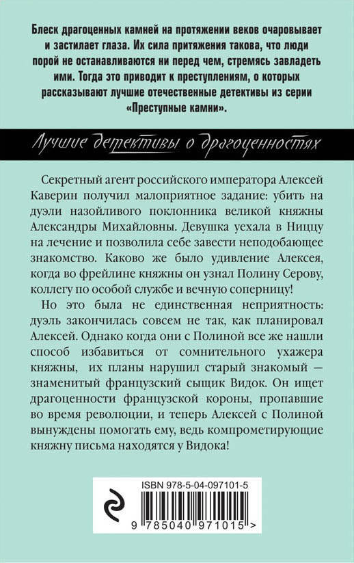 Блеск драгоценных камней на протяжении веков очаровывает и застилает глаза. Их сила притяжения такова, что люди порой не останавливаются ни перед чем, стремясь завладеть ими. Тогда это приводит к преступлениям, о которых рассказывают лучшие отечественные детективы из серии «Преступные камни».