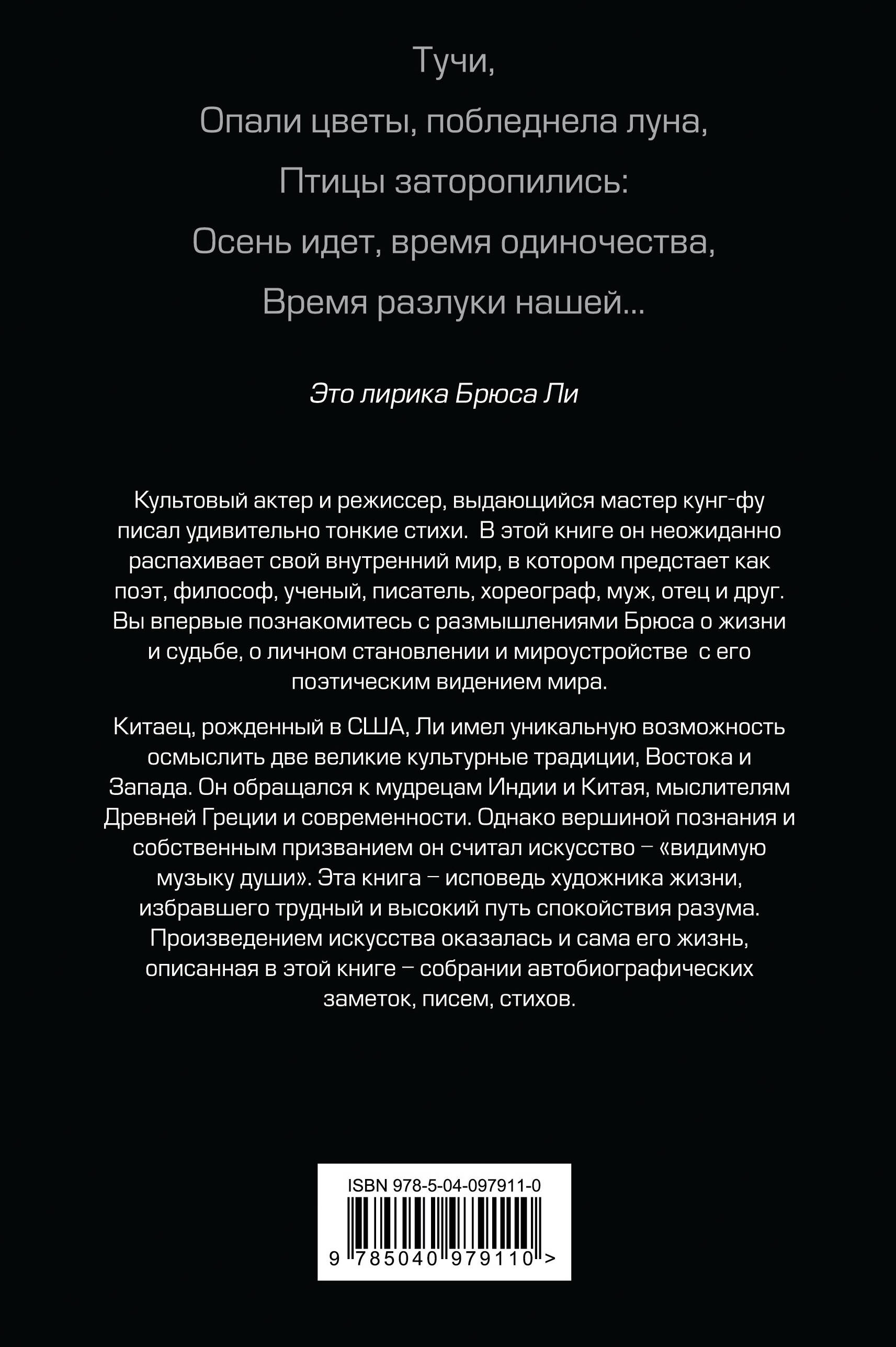 Неожиданные грани личности легендарного актера и режиссера Брюса Ли. Китаец, рожденный в США, Ли вобрал в себя две культурные традиции - Востока и Запада. Он обращался к мудрецам Индии и Китая, античным и современным философам. Однако вершиной познания он считал собственный путь разума, искусство создавать «видимую музыку души». Произведением искусства оказалась и сама его жизнь, описанная в этих мемуарах - собрании автобиографических заметок, писем, стихов разных лет. Эта книга - исповедь художника жизни, избравшего трудный путь подлинного самопознания. Культовый актер и режиссер, выдающийся мастер восточных единоборств открывает читателю свой внутренний мир, в котором предстает как поэт, философ, писатель, муж и отец.