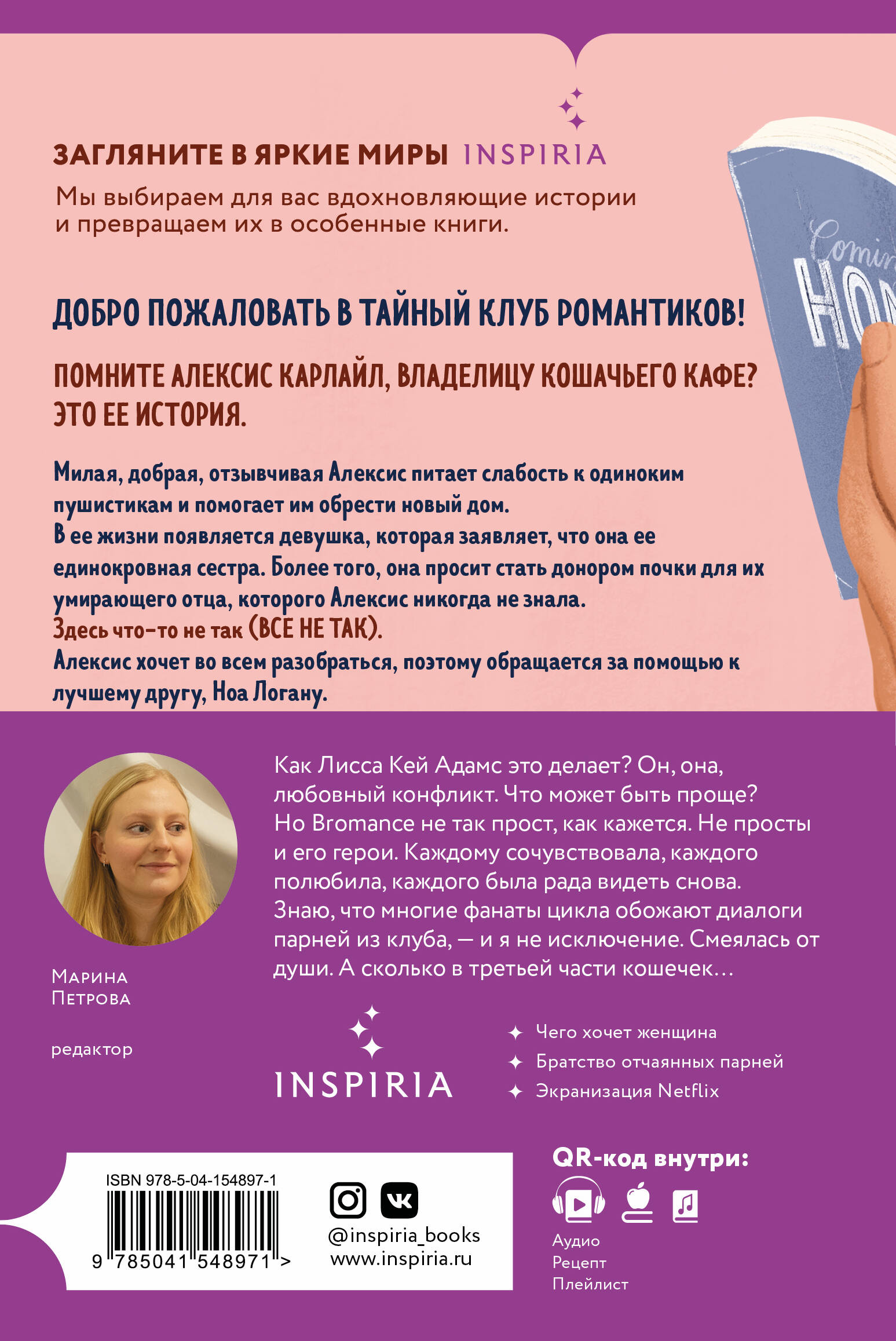 Комплект из трех книг цикла «Bromance» - истории, от которых невозможно оторваться. Книга Лиссы Кей Адамс надежно закрепились в списке лучших романтических историй Amazon. Готовится экранизация Netflix! Вам когда-нибудь хотелось залезть в чужую голову? Героям цикла «Bromance» - очень. Они пытаются разобраться в психологии взаимоотношений, ведь мужчины и женщины так по-разному рассуждают на тему любви. Романы Лиссы Кей Адамс поднимут вам настроение, особенно если вы женщина. А мужские диалоги рассмешат до слез. Это увлекательное чтение, которое заставит вас по-другому посмотреть на мужчин и женщин. Адамс затрагивает темы, о которых мы, казалось, знаем все, но с каждой страницей начинаем в этом сомневаться. «В каждом городе обязательно должен быть такой книжный клуб». - Эви Данмор Bromance. ТАЙНЫЙ КЛУБ РОМАНТИКОВ: Первое правило книжного клуба: никому не рассказывать о книжном клубе. Добро пожаловать в тайный клуб романтиков! Проблемы в отношениях? Встали не с той ноги? Не знаете, как жить дальше? Книжный клуб Bromance к вашим услугам. Мы называем его Bromance, ведь это больше, чем книжный клуб. Это братство. Вы спросите, как же все будет? Все просто. Члены клуба читают любовные романы, которые помогают разобраться в психологии взаимоотношений. Мы называем их «инструкциями». Заинтересованы? Еще бы. Чего у нас только не происходит… Заварушка на заварушке… Все вместе мы ищем ответ на, пожалуй, самый сложный вопрос: чего хочет женщина? И, кажется, мы его нашли. Только тсс… Никому ни слова. Bromance. ВСЕ СЕКРЕТЫ КНИЖНОГО КЛУБА: Второе правило книжного клуба: никому никогда не рассказывать о книжном клубе. Добро пожаловать в тайный клуб романтиков! Скучали? Сейчас мы это исправим. Лив Папандреас не позавидуешь. Ее босс, известный шеф-повар Ройс Престон, оказался тем еще мерзавцем, и теперь Лив вынуждена уйти с любимой работы. Но, как известно, принц на белом коне появляется в жизни принцессы очень вовремя. А вот и он, харизматичный предприниматель Брейден Мак. Погодите, но это не конь. Мак на «Порше»! Это будет настоящая спецоперация по завоеванию сердца прекрасной дамы, а коварный злодей в поварском колпаке обязательно получит по заслугам. Сможет ли книжный клуб Bromance помочь нашему самоуверенному принцу? Брейден Мак, пора и тебе узнать все секреты книжного клуба. А вы чего ждете? Bromance. КНИЖНЫЙ КЛУБ СПЕШИТ НА ПОМОЩЬ: Третье правило книжного клуба: в романе участвуют не только двое. Милая, добрая, отзывчивая Алексис питает слабость к одиноким пушистикам и помогает им обрести новый дом. В ее жизни появляется девушка, которая заявляет, что она ее единокровная сестра. Более того, она просит стать донором почки для их умирающего отца, которого Алексис никогда не знала. Здесь что-то не так (все не так). Алексис хочет во всем разобраться, поэтому обращается за помощью к лучшему другу, Ноа Логану. Ноа - компьютерный гений. На него вся надежда. Только у Ноа есть секрет: он по уши влюблен в Алексис. Эй, ребята из книжного клуба! Тут одному не справиться. Нужна ваша помощь.| Издательство | Эксмо |
