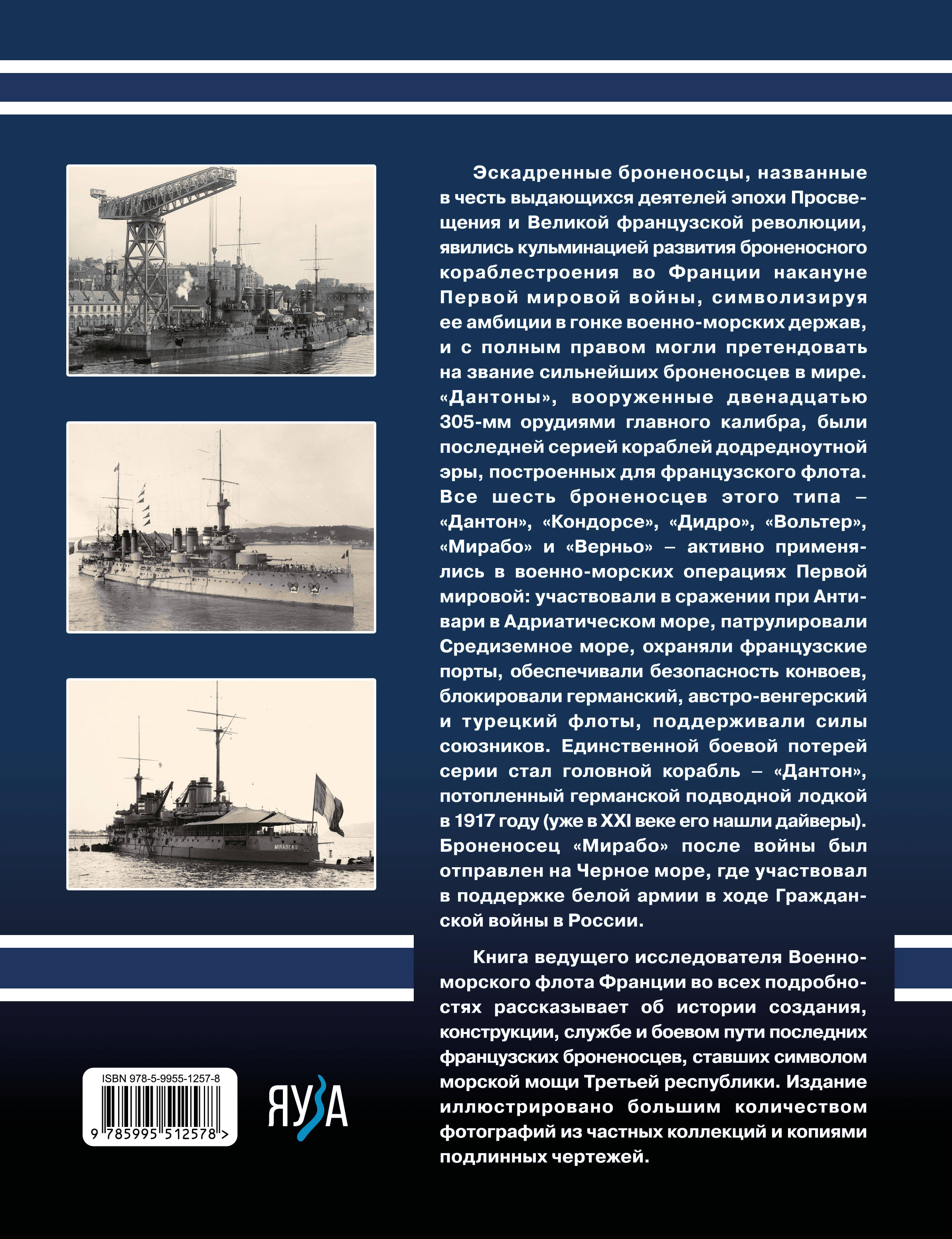 Эскадренные броненосцы, названные в честь выдающихся деятелей эпохи Просвещения и Великой Французской революции, явились кульминацией развития кораблестроения во Франции накануне Первой Мировой войны, символизируя ее амбиции в гонке военно-морских держав и с полным правом могли претендовать на звание сильнейших в мире. Броненосцы типа "Дантон", вооруженные двенадцатью 305-мм орудиями главного калибра, были последней серией кораблей додредноутной эры, построенных для французского флота. Все шесть броненосцев, "Дантон", "Кондорсе", "Дидро", "Вольтер", "Мирабо" и "Верньо", активно применялись в военно-морских операциях Первой Мировой: участвовали в сражении при Антивари в Адриатическом море, патрулировали Средиземное море, охраняли французские порты, обеспечивали безопасность конвоев, блокировали германский, австро-венгерский и турецкий флоты, поддерживали силы союзников. Единственной боевой потерей серии стал головной корабль - "Дантон", потопленный германской подводной лодкой в 1917 году (уже в XXI веке на дне его нашли дайверы). Броненосец "Мирабо" после войны был отправлен на Черное море, где участвовал в поддержке Белой армии во время Гражданской войны в России. Книга ведущего исследователя военно-морского флота Франции во всех подробностях рассказывает об истории создания, конструкции, службе и боевом пути последних французских броненосцев, ставших символом морской мощи Третьей республики. Издание иллюстрированно большим количеством фотографий из частных коллекций и копиями подлинных чертежей.| Издательство | Яуза-пресс ООО |