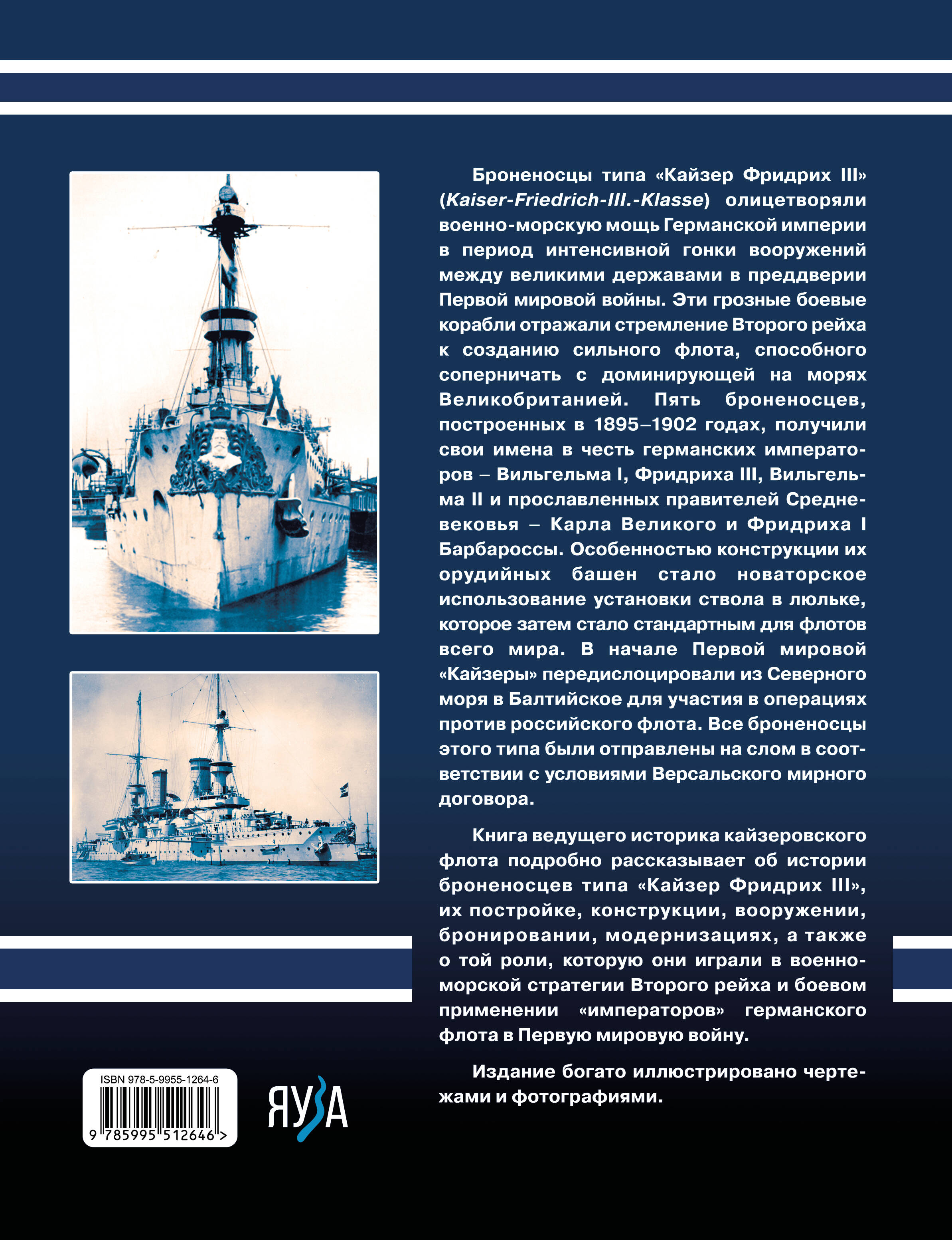 Броненосцы типа "Кайзер Фридрих III" (Kaiser-Friedrich-III.-Klasse) олицетворяли военно-морскую мощь Германской империи в период интенсивной гонки вооружений между великими державами в преддверии Первой Мировой войны. Эти грозные боевые корабли отражали стремление Второго Рейха к созданию сильного флота, способного соперничать с доминирующей на морях Великобританией. Пять броненосцев, построенных в 1895-1902 годах, получили свои имена в честь германских императоров - Вильгельма I, Фридриха III, Вильгельма II и прославленных правителей Средневековья - Карла Великого и Фридриха I Барбароссы. Особенностью конструкции их орудийных башен стало новаторское использование установки ствола в люльке, которое затем стало стандартным для флотов всего мира. В начале Первой Мировой "Кайзеры" передислоцировали из Северного моря в Балтийское для участия в операциях против российского флота. Все броненосцы этого типа были отправлены на слом в соответствии с условиями Версальского мирного договора. Книга ведущего историка кайзеровского флота подробно рассказывает об истории броненосцев типа "Кайзер Фридрих III", их постройке, конструкции, вооружении, бронировании, модернизациях, а также о той роли, которую они играли в военно-морской стратегии Второго Рейха и боевом применении "императоров" германского флота в Первую Мировую войну. Издание богато иллюстрировано чертежами и фотографиями.| Издательство | Яуза-пресс ООО |