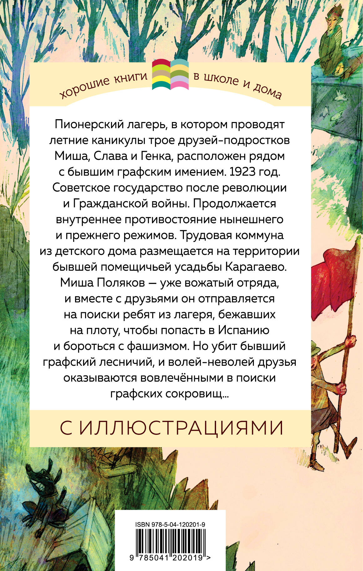 Пионерский лагерь, в котором проводят летние каникулы трое друзей-подростков - Миша, Слава и Генка, расположен рядом с бывшим графским имением. 1923 год. Советское государство после революции и Гражданской войны. Продолжается внутреннее противостояние нынешнего и прежнего режимов. Трудовая коммуна из детского дома размещается на территории бывшей помещичьей усадьбы Карагаево. Миша Поляков - уже вожатый отряда, и вместе с друзьями он отправляется на поиски ребят из лагеря, бежавших на плоту, чтобы попасть в Испанию и бороться с фашизмом. Но убит бывший графский лесничий, и волей-неволей друзья оказываются вовлеченными в поиски графских сокровищ…| Издательство | ООО "Издательство "Эксмо" |