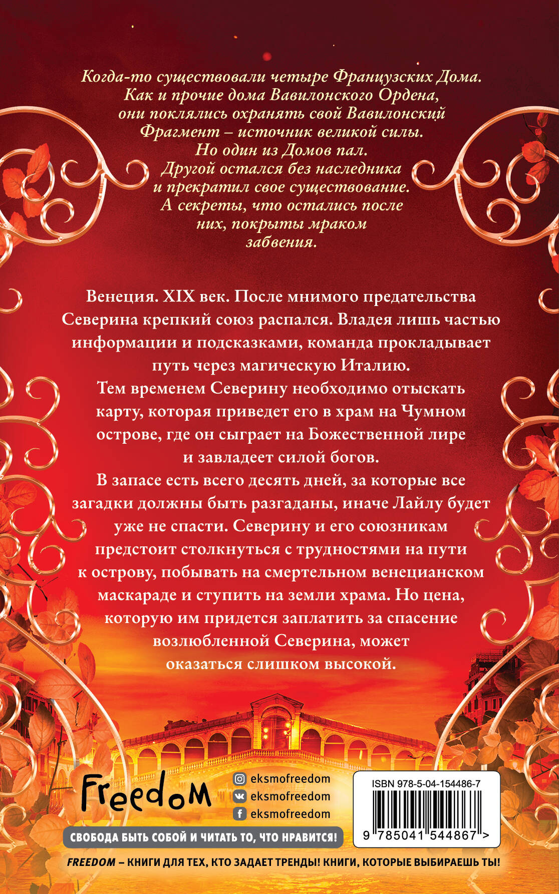 Венеция. XIX век. После мнимого предательства Северина крепкий союз распался. Владея лишь частью информации и подсказками, команда прокладывает путь через шумную и магическую Италию. Тем временем, Северину необходимо отыскать карту, которая приведет его в храм на Чумном острове, где он сыграет на Божественной лире и завладеет силой богов. В запасе есть всего десять дней, за которые все загадки должны быть разгаданы, иначе Лайлу будет уже не спасти. Северину и его союзникам предстоит столкнуться с трудностями на пути к острову, побывать на смертельном венецианском маскараде и ступить на земли храма. Но цена, которую им придется заплатить за спасение возлюбленной Северина, может оказаться слишком высокой. Продолжение захватывающего приключения от автора бестселлеров New York Times Рошани Чокши. Венеция XIX века, Божественная лира, смертельные маскарады, невероятные песни, чарующей красоты храмы. Уникальная возможность насладиться атмосферой Италии. Романы писательницы удостоились восторженных отзывов знаменитых современных авторов бестселлеров: Холли Блэк, Лэйни Тейлор, Стефани Гарбер, Эдриенн Янг. Завершающая часть трилогии «Гильдии волков» расскажет последнюю историю, полную тайн и опасностей. Романы писательницы стали номинантами премии, среди которых премия «Локус», «Небула», «Лучшая книжная новинка» по версии Barnes and Nobles и «Лучшая книга года» по версии Buzzfeed. Еще до выхода в свет книгу добавили более 19 тыс. человек на портале Goodreads.com. «Потрясающий финал серии. Рошани Чокши в очередной раз смогла удивить завершающей историей». - Goodreads.com| Издательство | ООО "Издательство "Эксмо" |