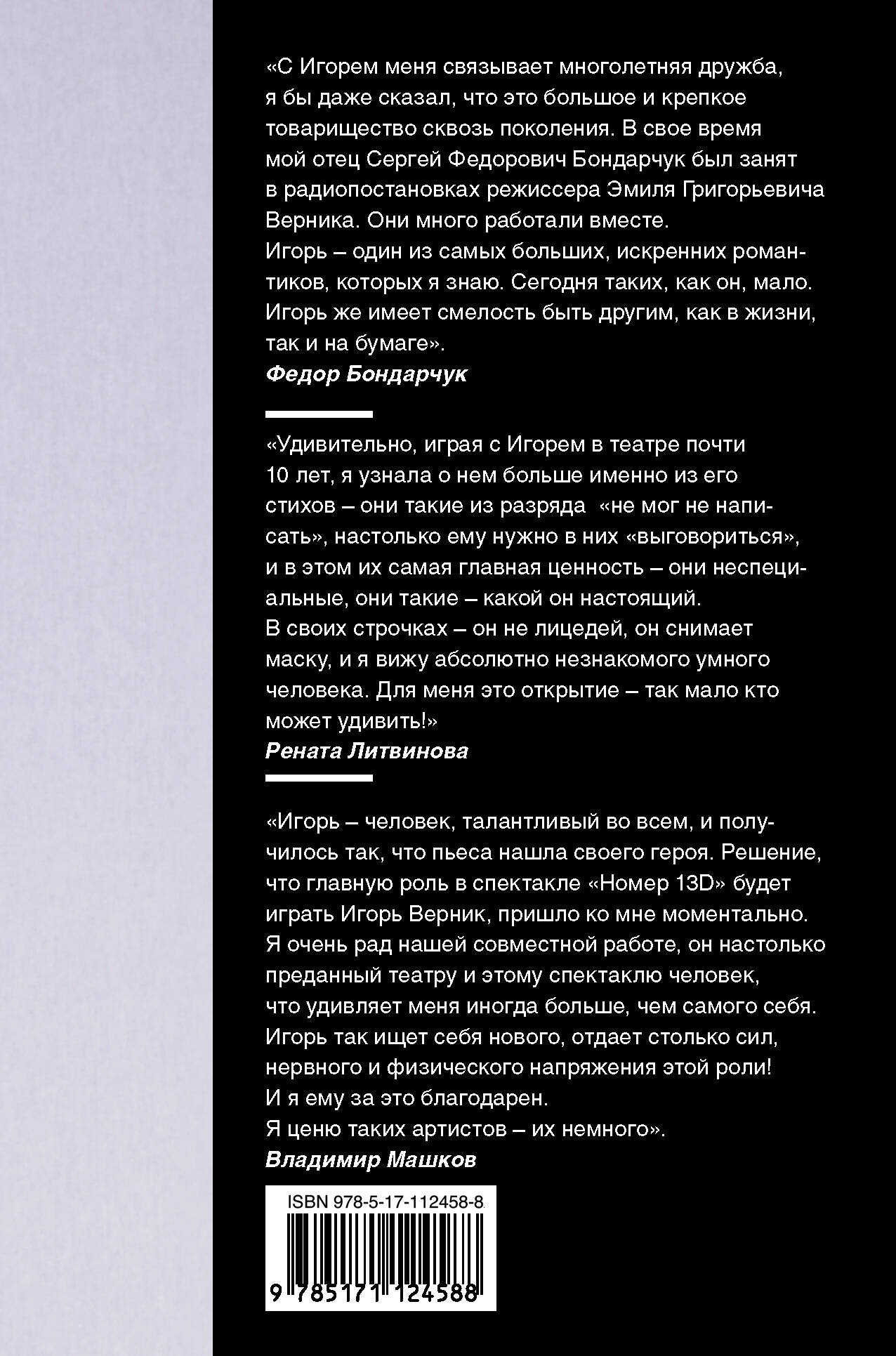 Игорь Верник - российский актер театра и кино, народный артист РФ, теле- и радиоведущий, актер Московского Художественного театра им. Чехова. В его книгу вошли стихи и дневниковые записи разных лет. Это тексты, открывающие читателю порой неожиданные грани творческой, человеческой натуры актера. Тексты, брошенные как вызов самому себе - как попытка явить миру свое естество, на что, конечно, осмелится не каждый.| Издательство | ИЗДАТЕЛЬСТВО "АСТ" |