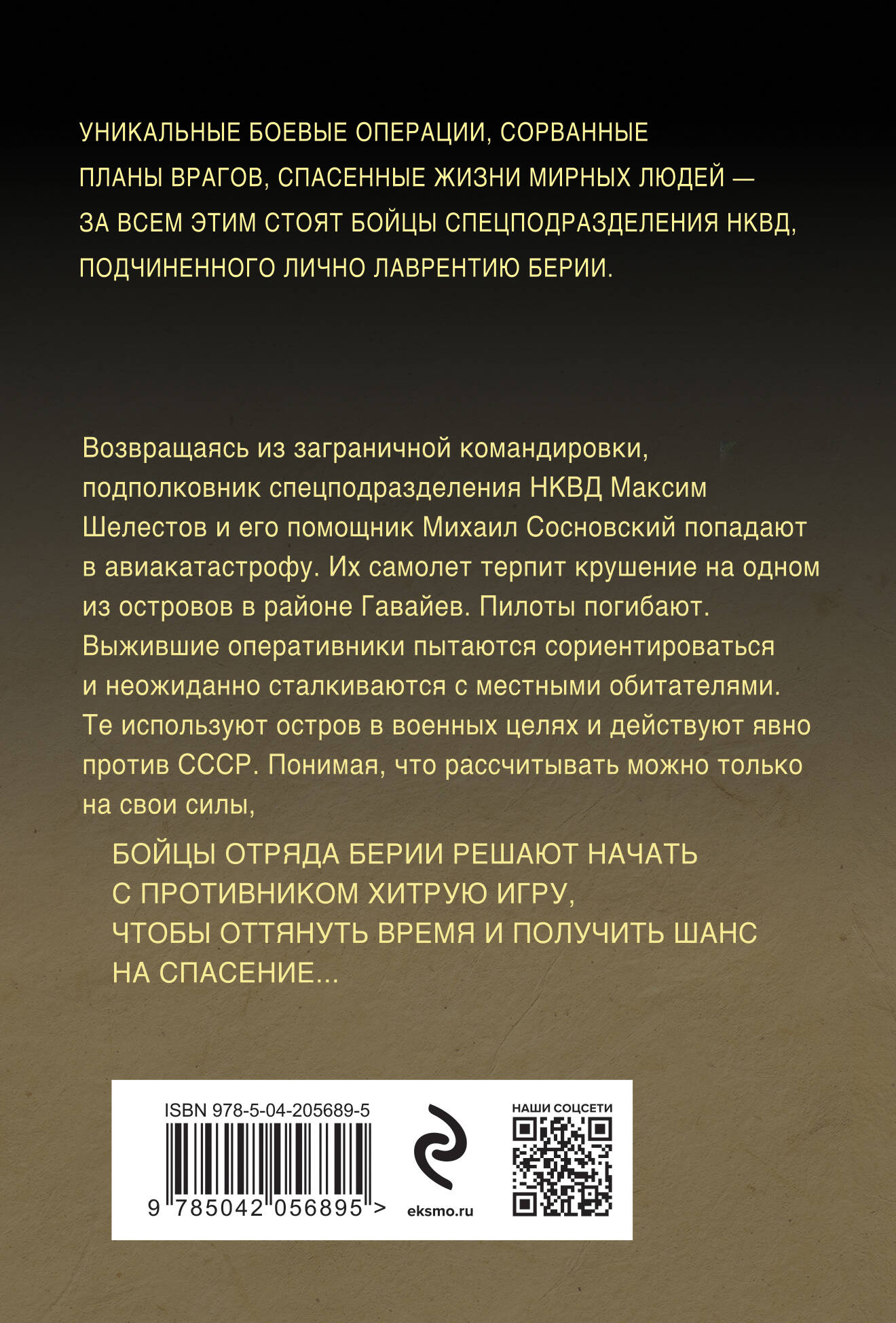 Роман о военном времени, о сложных судьбах и опасной работе неизвестных героев, вошедших в ударный состав «спецназа Берии». Возвращаясь из заграничной командировки, подполковник спецподразделения НКВД Максим Шелестов и его помощник Михаил Сосновский попадают в авиакатастрофу. Их самолет терпит крушение над одним из островов в районе Гавайев. Пилоты погибают. Выжившие оперативники пытаются сориентироваться и неожиданно сталкиваются с местными обитателями. Те используют остров в военных целях и действуют явно против СССР. Понимая, что рассчитывать можно только на свои силы, бойцы отряда Берии решают начать с противником хитрую «игру», чтобы оттянуть время и получить шанс на спасение... «Эта серия хороша тем, что в ней проведена верная главная мысль: в НКВД Лаврентия Берии умели верить людям, потому что им умел верить сам нарком. История группы майора Шелестова сходна с реальной историей крупного агента абвера, бывшего штабс-капитана царской армии Нелидова, попавшего на Лубянку в сентябре 1939 года. Тем более вероятными выглядят на фоне истории Нелидова приключения Максима Шелестова и его товарищей, описанные в этом романе». - С. Кремлев Общий тираж книг А. Тамоникова - более 10 миллионов экземпляров.| Издательство | ООО "Издательство "Эксмо" |