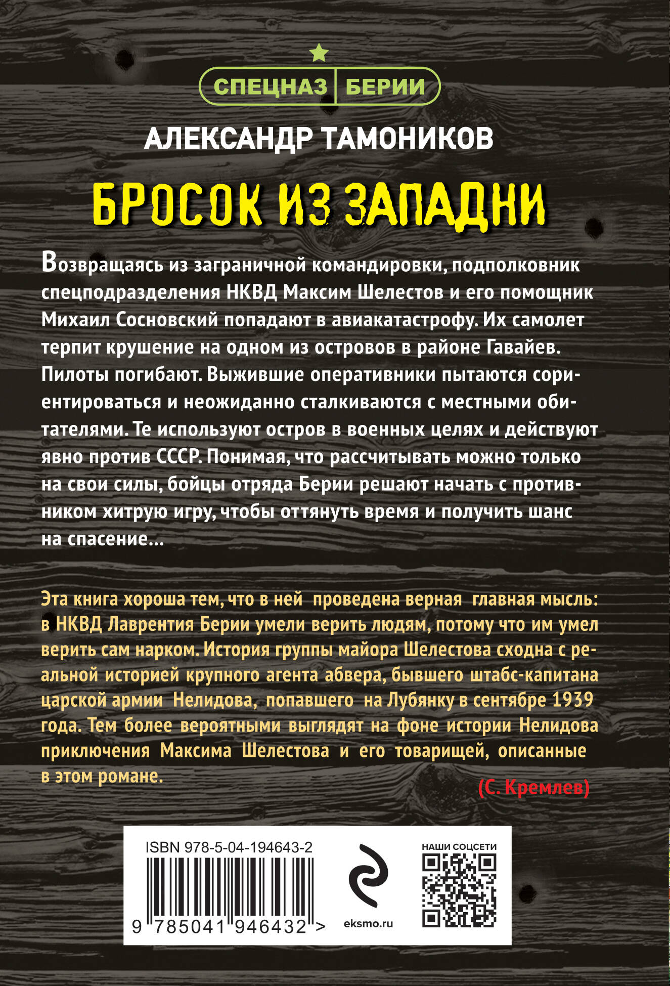 Роман о военном времени, о сложных судьбах и опасной работе неизвестных героев, вошедших в ударный состав «спецназа Берии». Возвращаясь из заграничной командировки, подполковник спецподразделения НКВД Максим Шелестов и его помощник Михаил Сосновский попадают в авиакатастрофу. Их самолет терпит крушение над одним из островов в районе Гавайев. Пилоты погибают. Выжившие оперативники пытаются сориентироваться и неожиданно сталкиваются с местными обитателями. Те используют остров в военных целях и действуют явно против СССР. Понимая, что рассчитывать можно только на свои силы, бойцы отряда Берии решают начать с противником хитрую «игру», чтобы оттянуть время и получить шанс на спасение... «Эта серия хороша тем, что в ней проведена верная главная мысль: в НКВД Лаврентия Берии умели верить людям, потому что им умел верить сам нарком. История группы майора Шелестова сходна с реальной историей крупного агента абвера, бывшего штабс-капитана царской армии Нелидова, попавшего на Лубянку в сентябре 1939 года. Тем более вероятными выглядят на фоне истории Нелидова приключения Максима Шелестова и его товарищей, описанные в этом романе». - С. Кремлев Общий тираж книг А. Тамоникова - более 10 миллионов экземпляров.| Издательство | ООО "Издательство "Эксмо" |