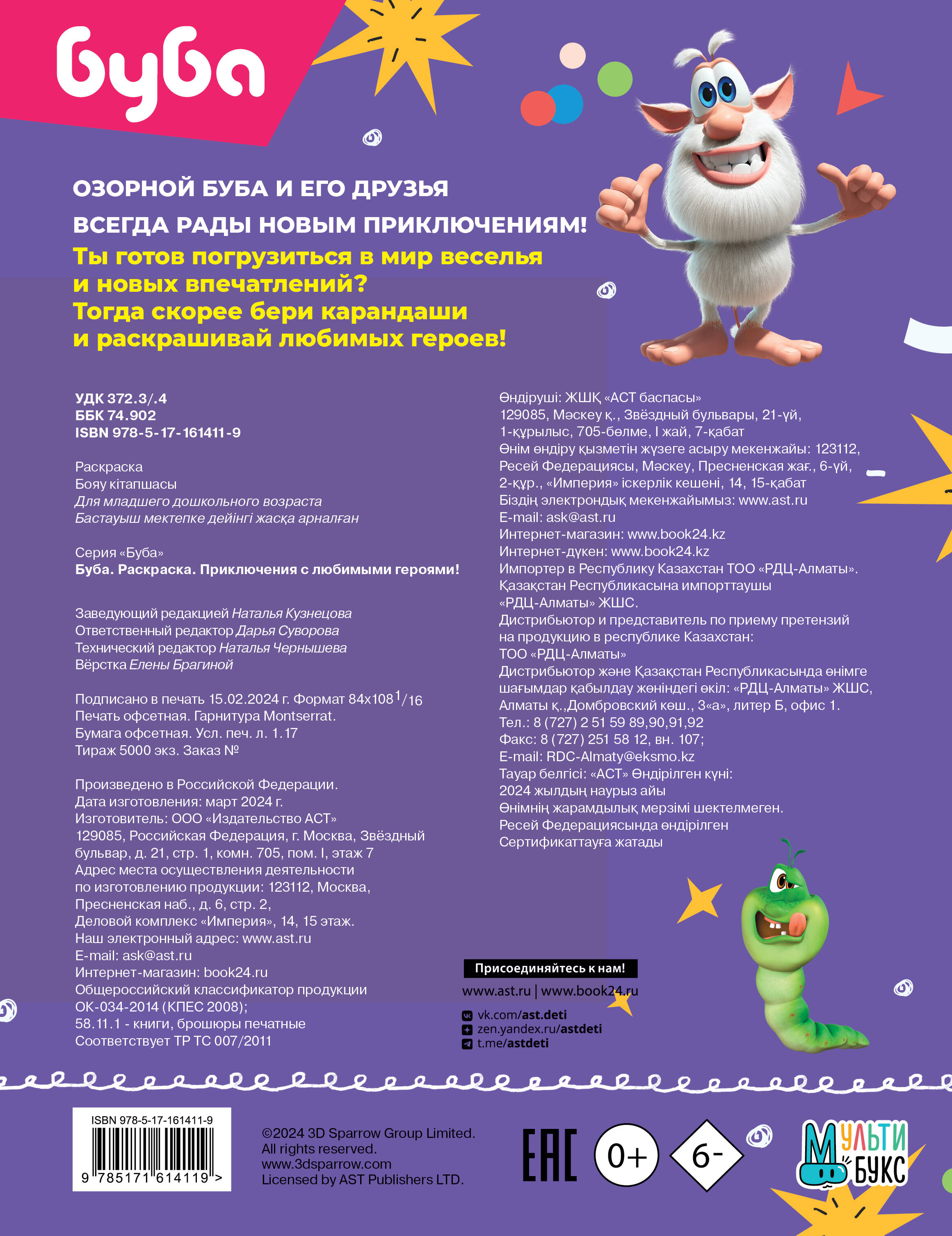 Озорной Буба и его друзья всегда рады новым приключениям! Ты готов погрузиться в мир веселья и новых впечатлений? Тогда скорее бери карандаши и раскрашивай любимых героев!| Издательство | Издательство "АСТ" |